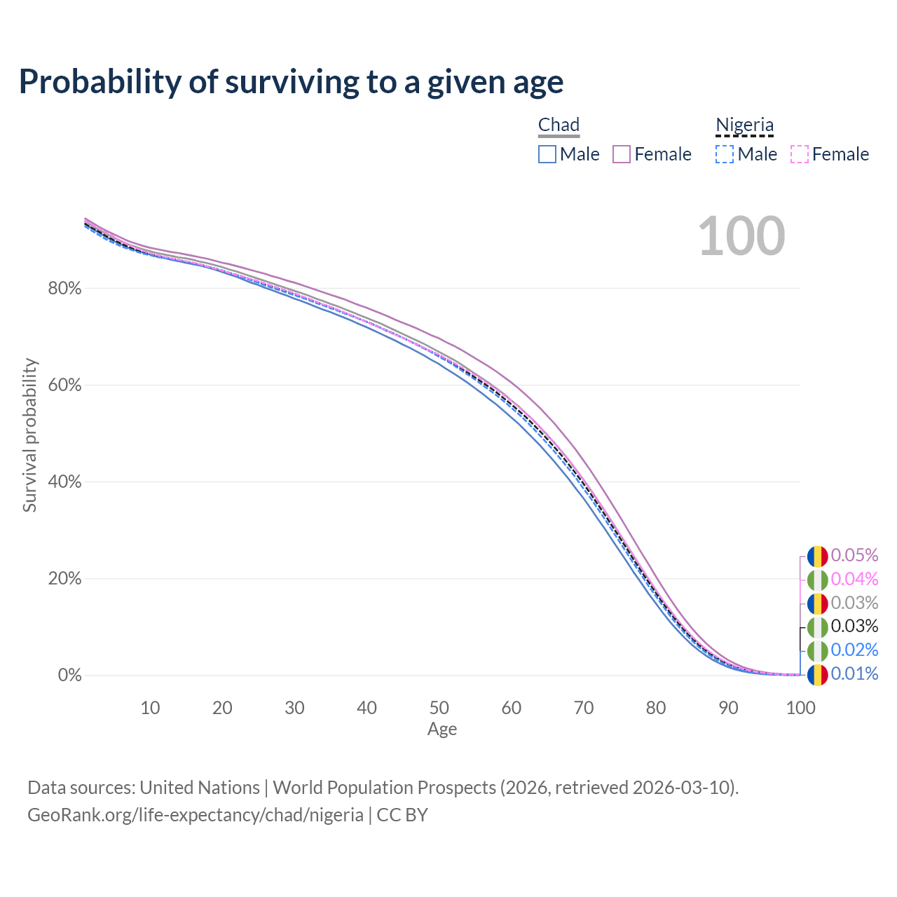 This life expectancy calculator shows the odds of living to 100, 95, 90, and below based on current age for both males and females in Chad and Nigeria, along with mean and median age of death. The calculations are based on the 2026 life tables (actuarial tables) from the UN World Population Prospects.