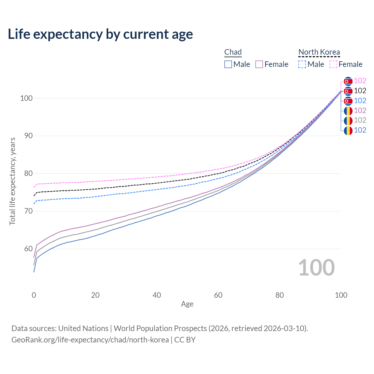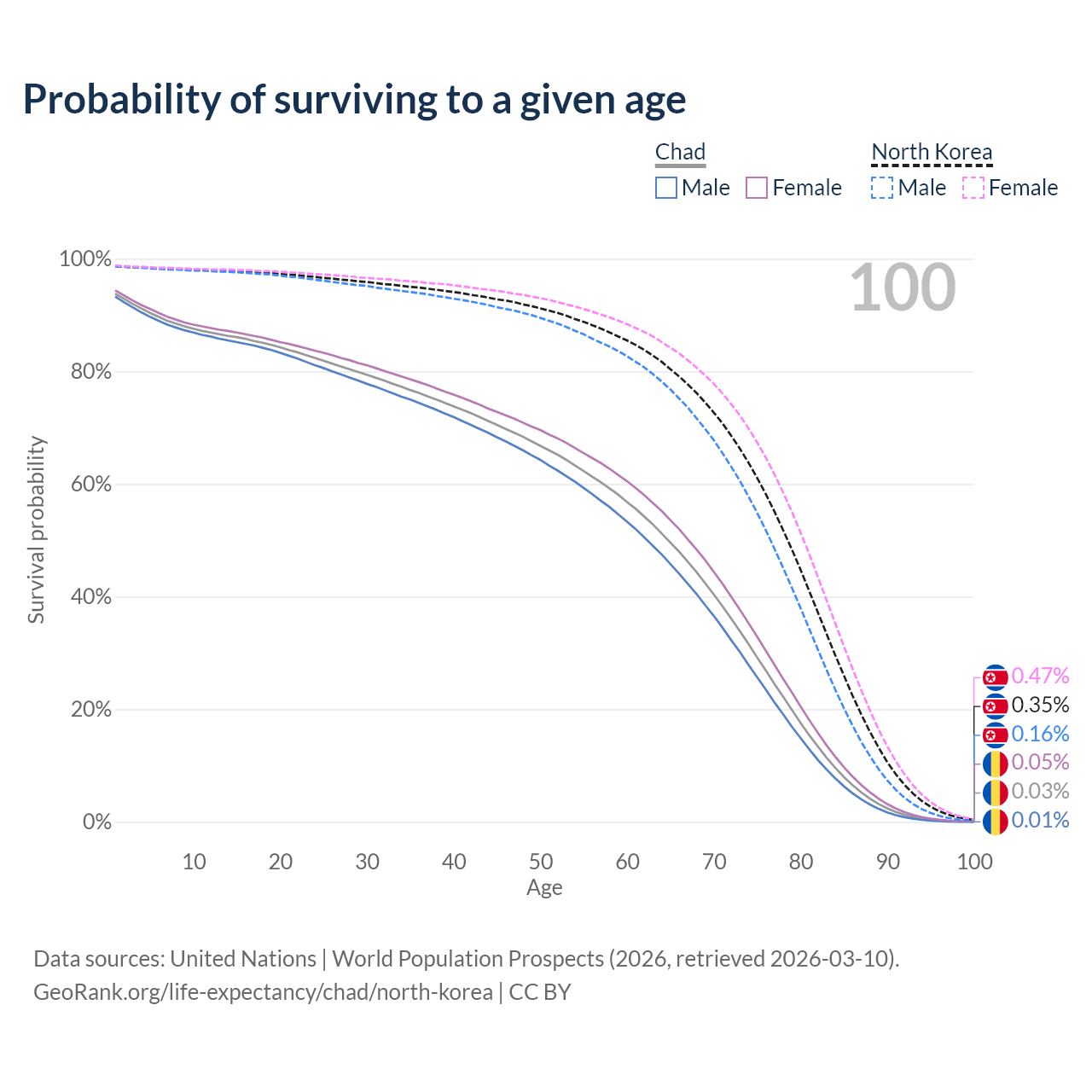 This life expectancy calculator shows the odds of living to 100, 95, 90, and below based on current age for both males and females in Chad and North Korea, along with mean and median age of death. The calculations are based on the 2026 life tables (actuarial tables) from the UN World Population Prospects.