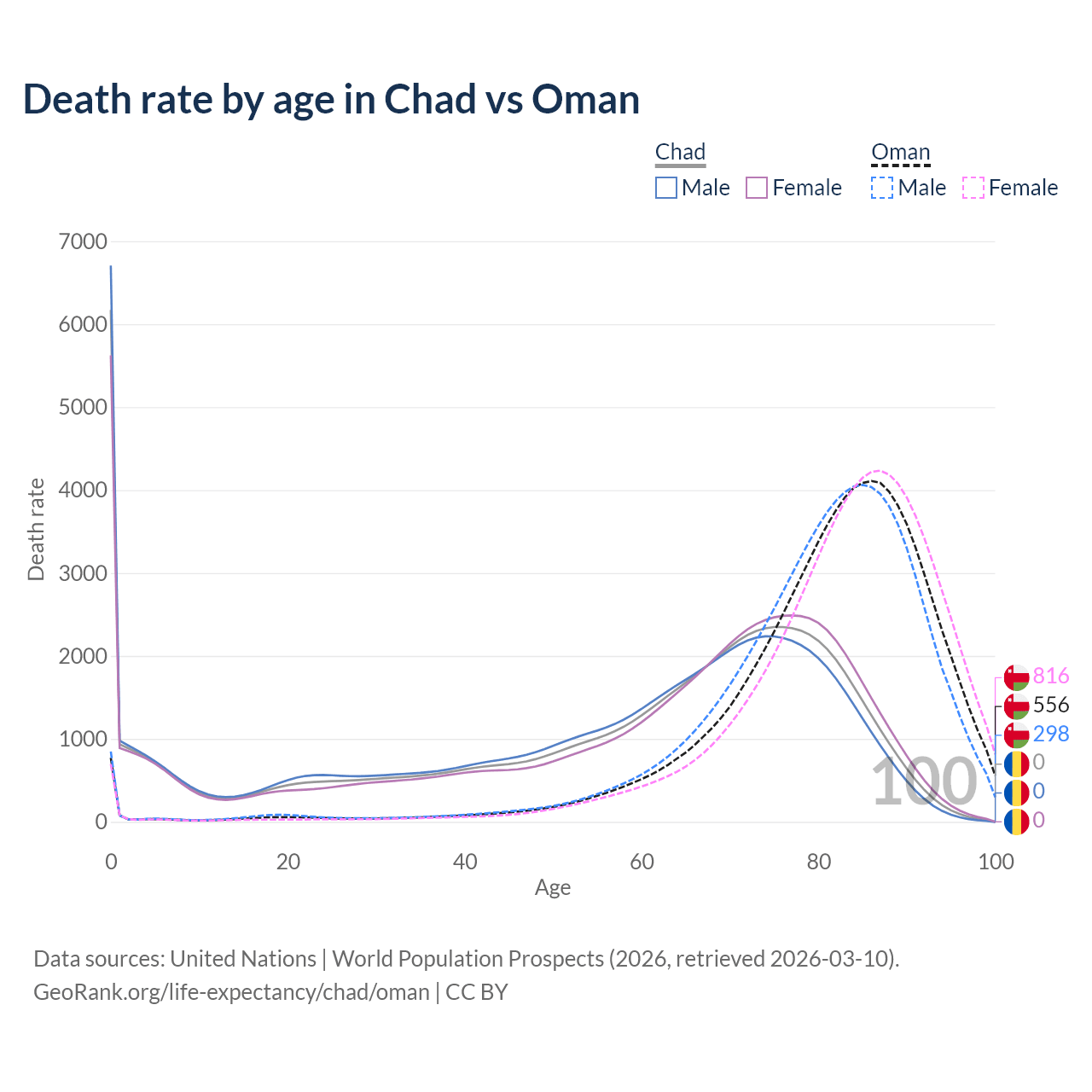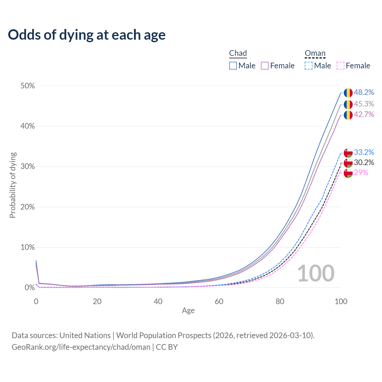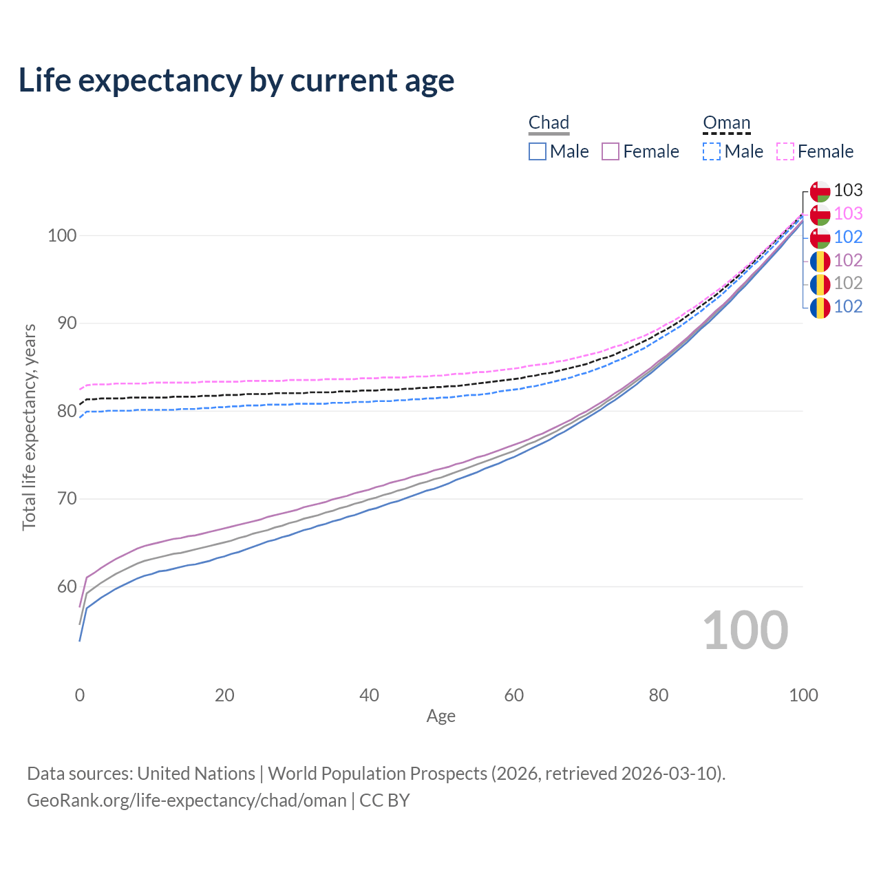 This life expectancy calculator shows the odds of living to 100, 95, 90, and below based on current age for both males and females in Chad and Oman, along with mean and median age of death. The calculations are based on the 2026 life tables (actuarial tables) from the UN World Population Prospects.