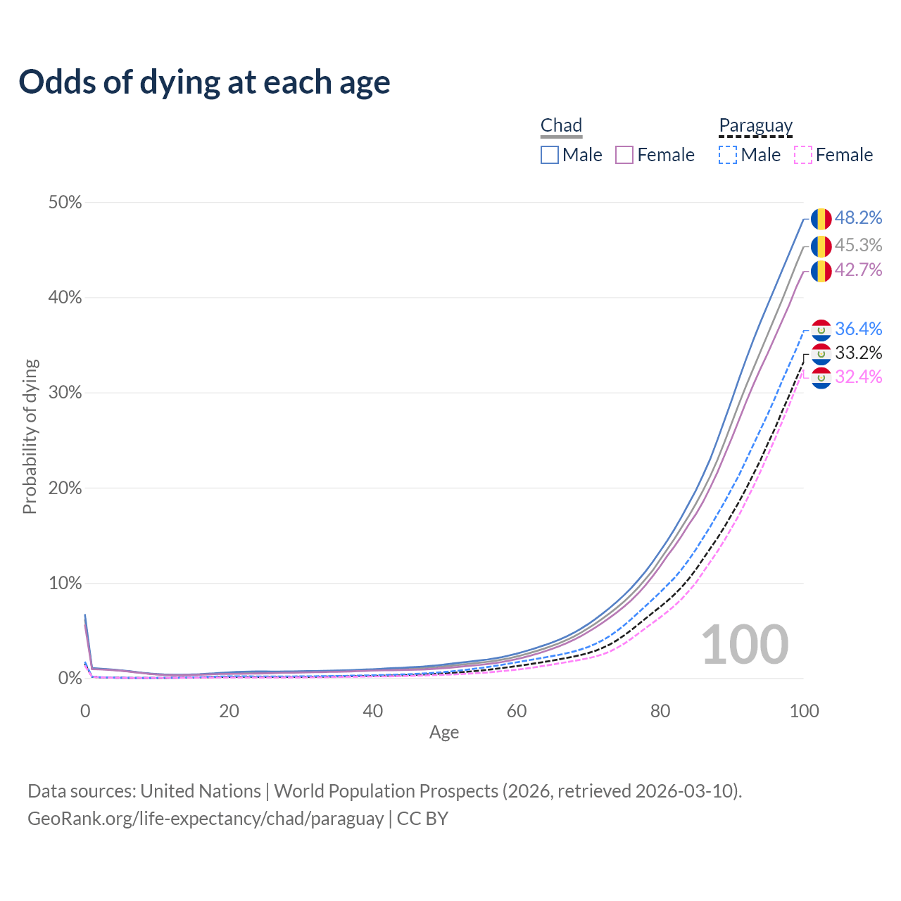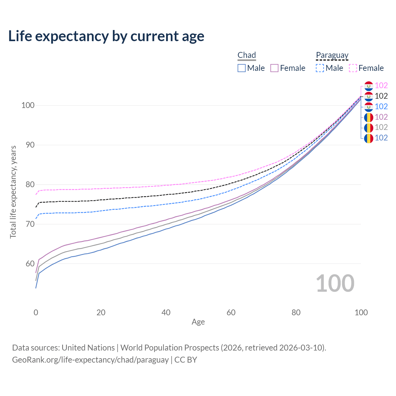 This life expectancy calculator shows the odds of living to 100, 95, 90, and below based on current age for both males and females in Chad and Paraguay, along with mean and median age of death. The calculations are based on the 2026 life tables (actuarial tables) from the UN World Population Prospects.