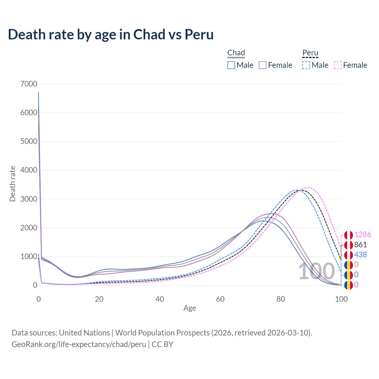The average life expectancy at birth is 55.6 years in Chad vs 78.3 in Peru. Chad is ranked 196/197 by life expectancy, and Peru is 59/197. In Chad, the life expectancy is 53.7 years for males and 57.6 years for females. In Peru, it's 76 years for males and 80.6 years for females.