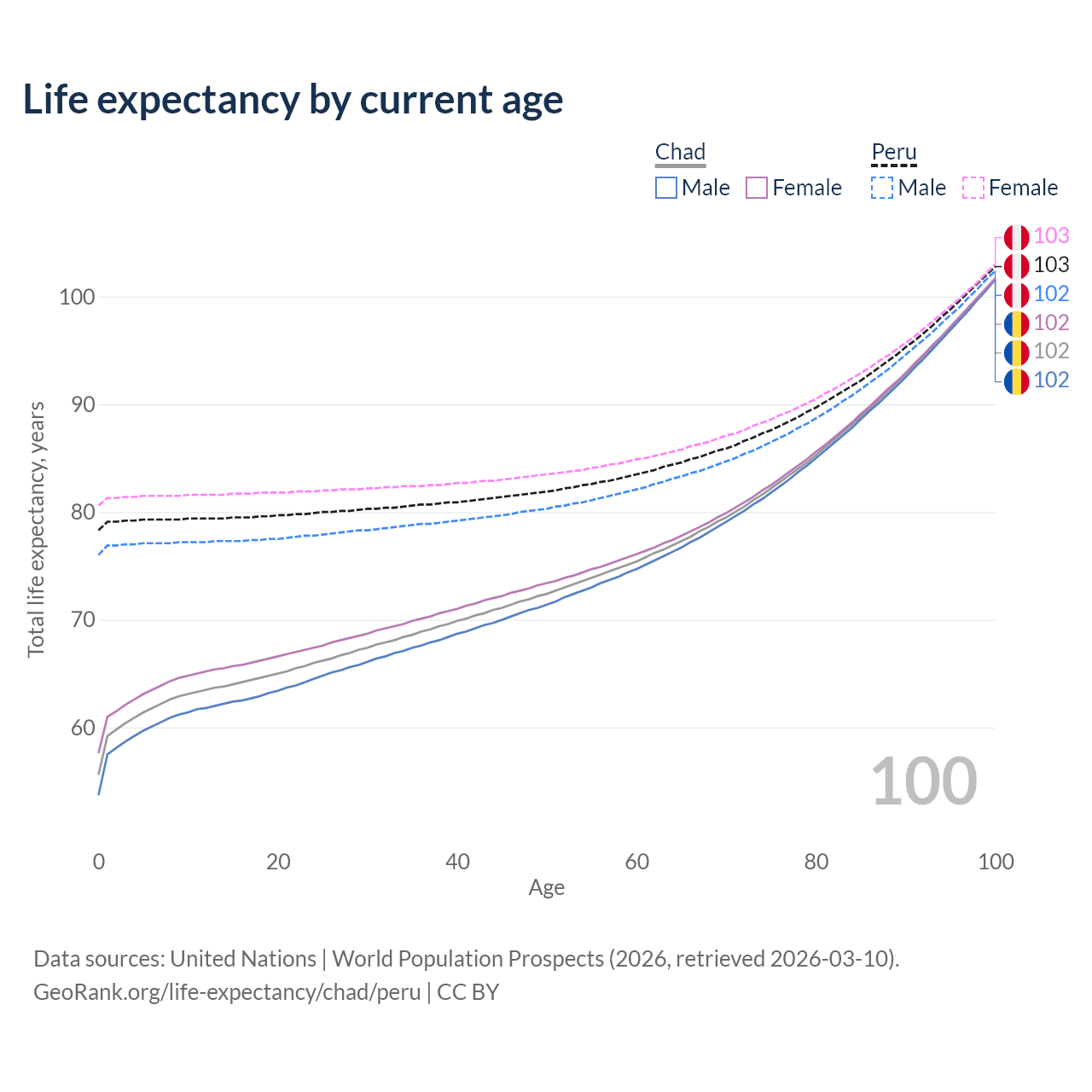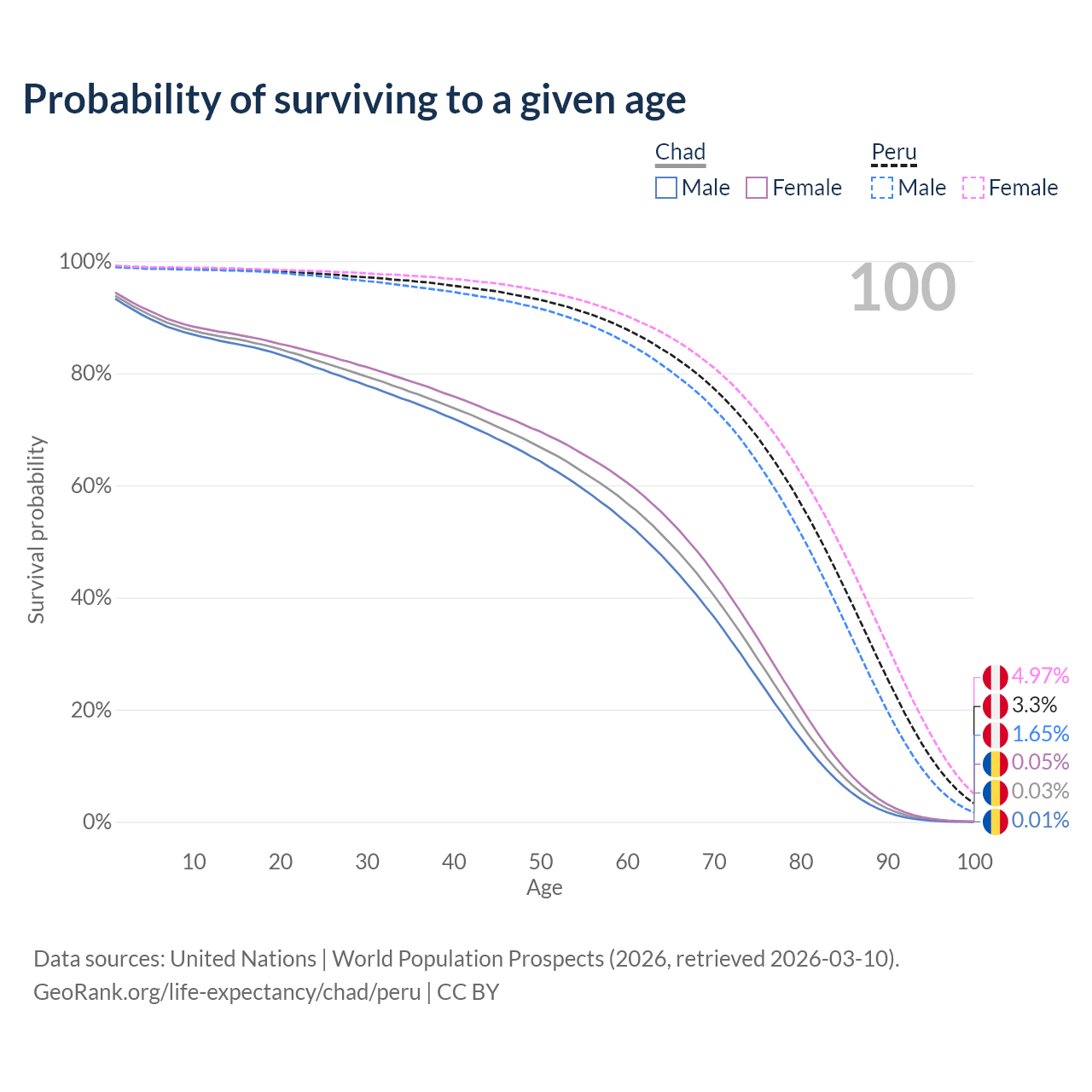 This life expectancy calculator shows the odds of living to 100, 95, 90, and below based on current age for both males and females in Chad and Peru, along with mean and median age of death. The calculations are based on the 2026 life tables (actuarial tables) from the UN World Population Prospects.
