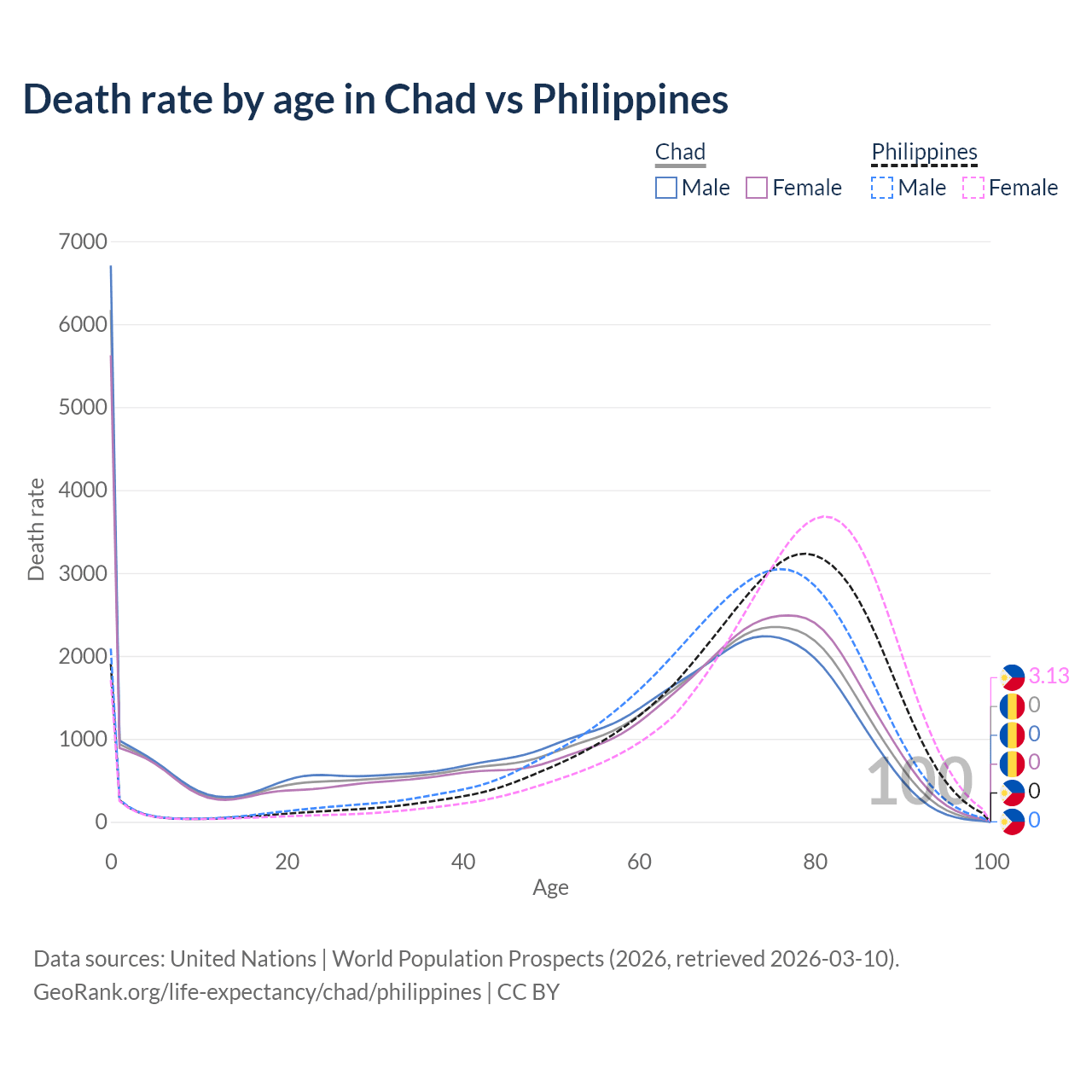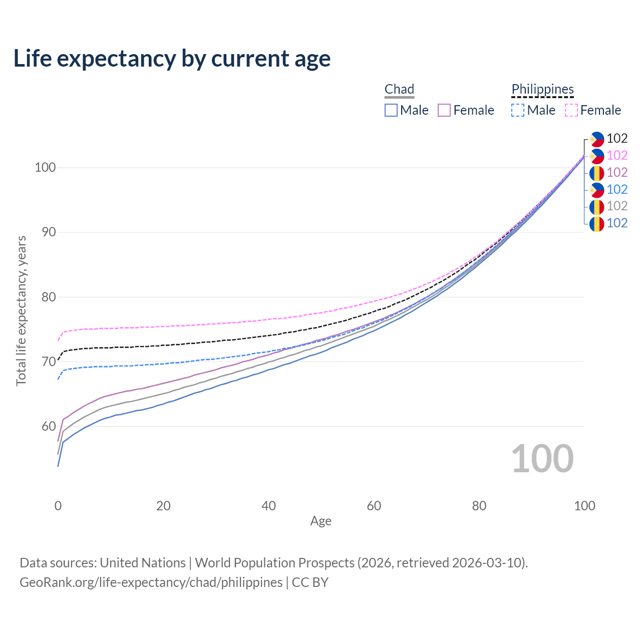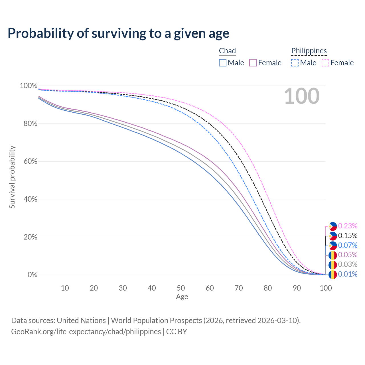 This life expectancy calculator shows the odds of living to 100, 95, 90, and below based on current age for both males and females in Chad and the Philippines, along with mean and median age of death. The calculations are based on the 2026 life tables (actuarial tables) from the UN World Population Prospects.