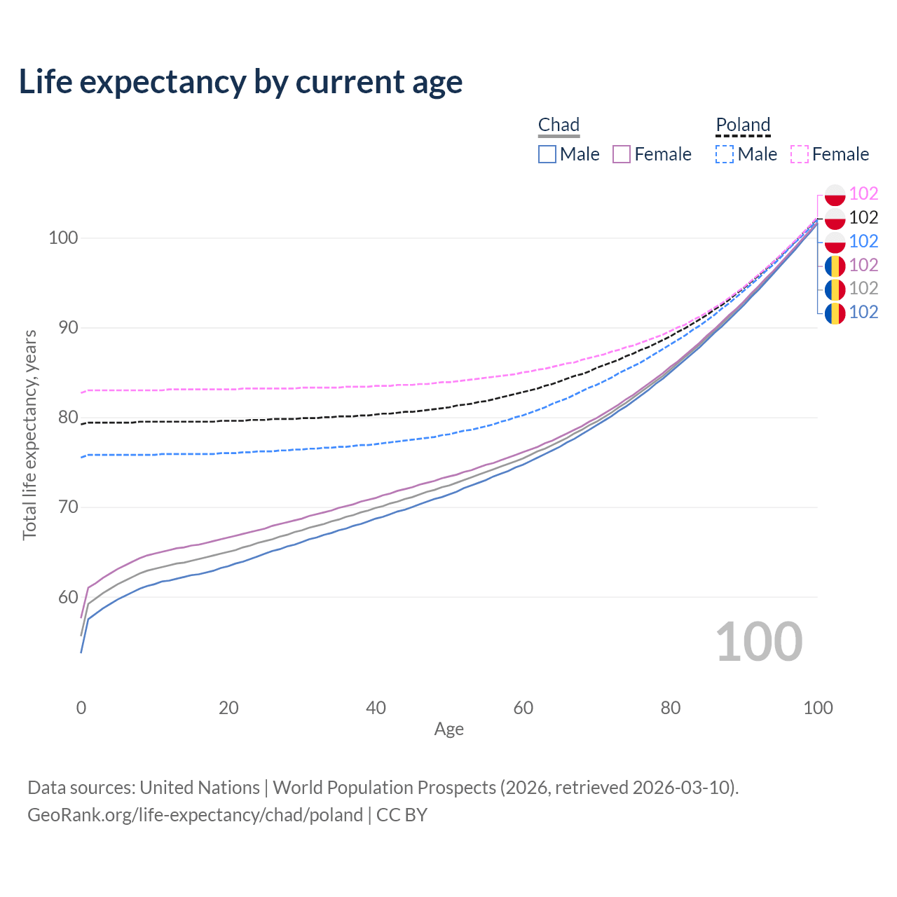 This life expectancy calculator shows the odds of living to 100, 95, 90, and below based on current age for both males and females in Chad and Poland, along with mean and median age of death. The calculations are based on the 2026 life tables (actuarial tables) from the UN World Population Prospects.