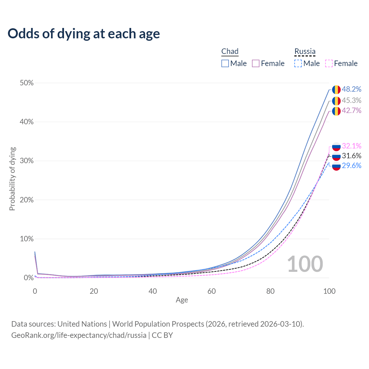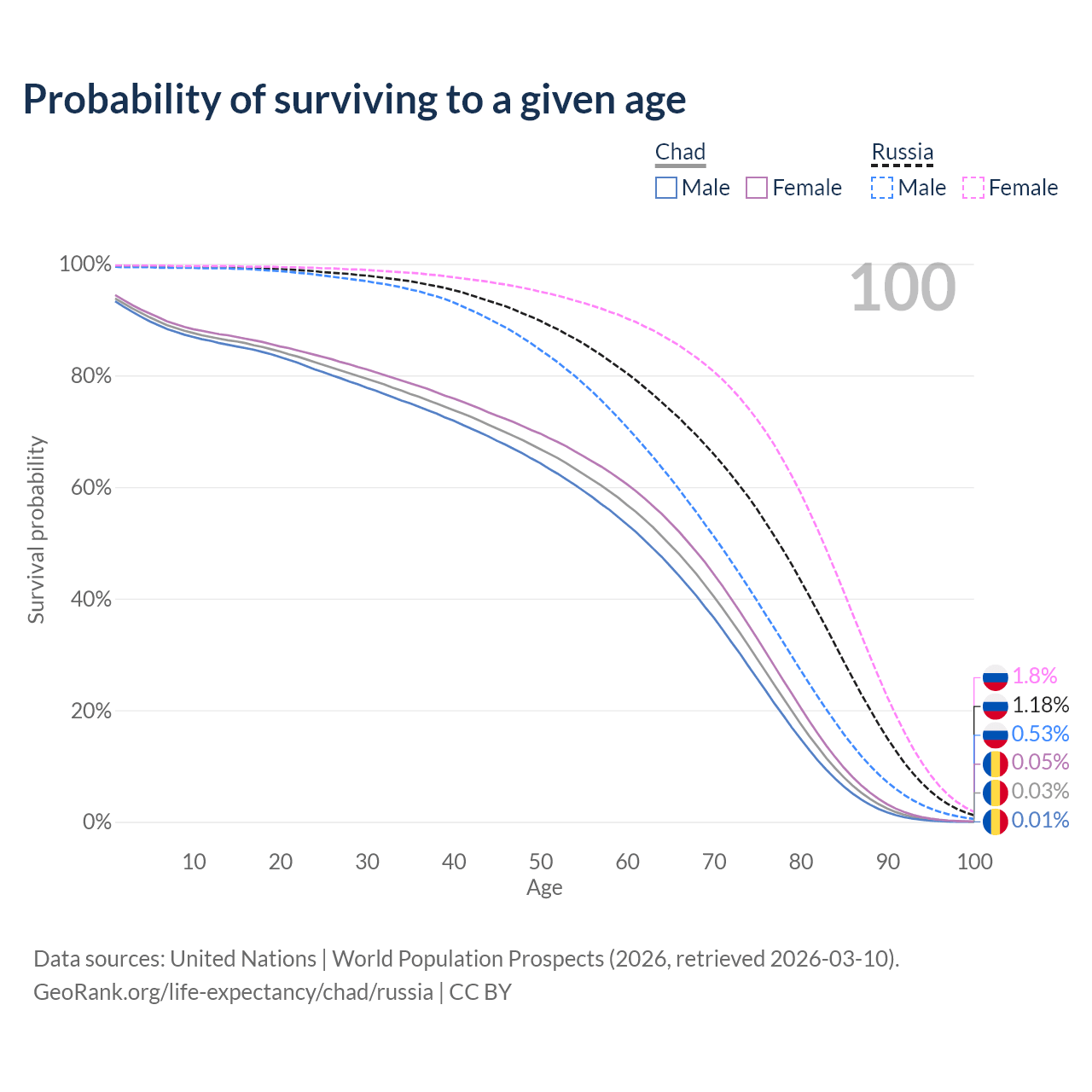 This life expectancy calculator shows the odds of living to 100, 95, 90, and below based on current age for both males and females in Chad and Russia, along with mean and median age of death. The calculations are based on the 2026 life tables (actuarial tables) from the UN World Population Prospects.