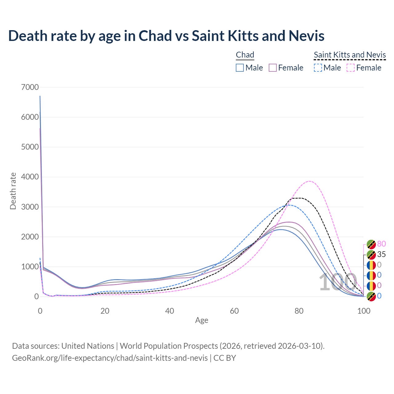 In Chad, the most common age of death is 0, compared to 80 in Saint Kitts and Nevis. The median age of death is 64.8 in Chad and 76.3 in Saint Kitts and Nevis, meaning only half of each cohort is expected to live past that age.