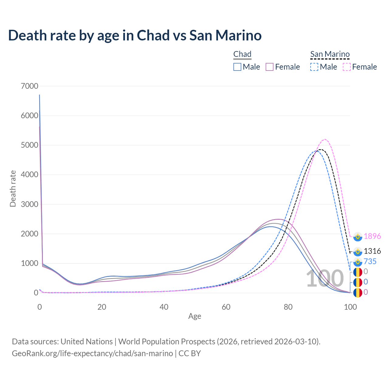 In Chad, the most common age of death is 0, compared to 91 in San Marino. The median age of death is 64.8 in Chad and 88.3 in San Marino, meaning only half of each cohort is expected to live past that age.