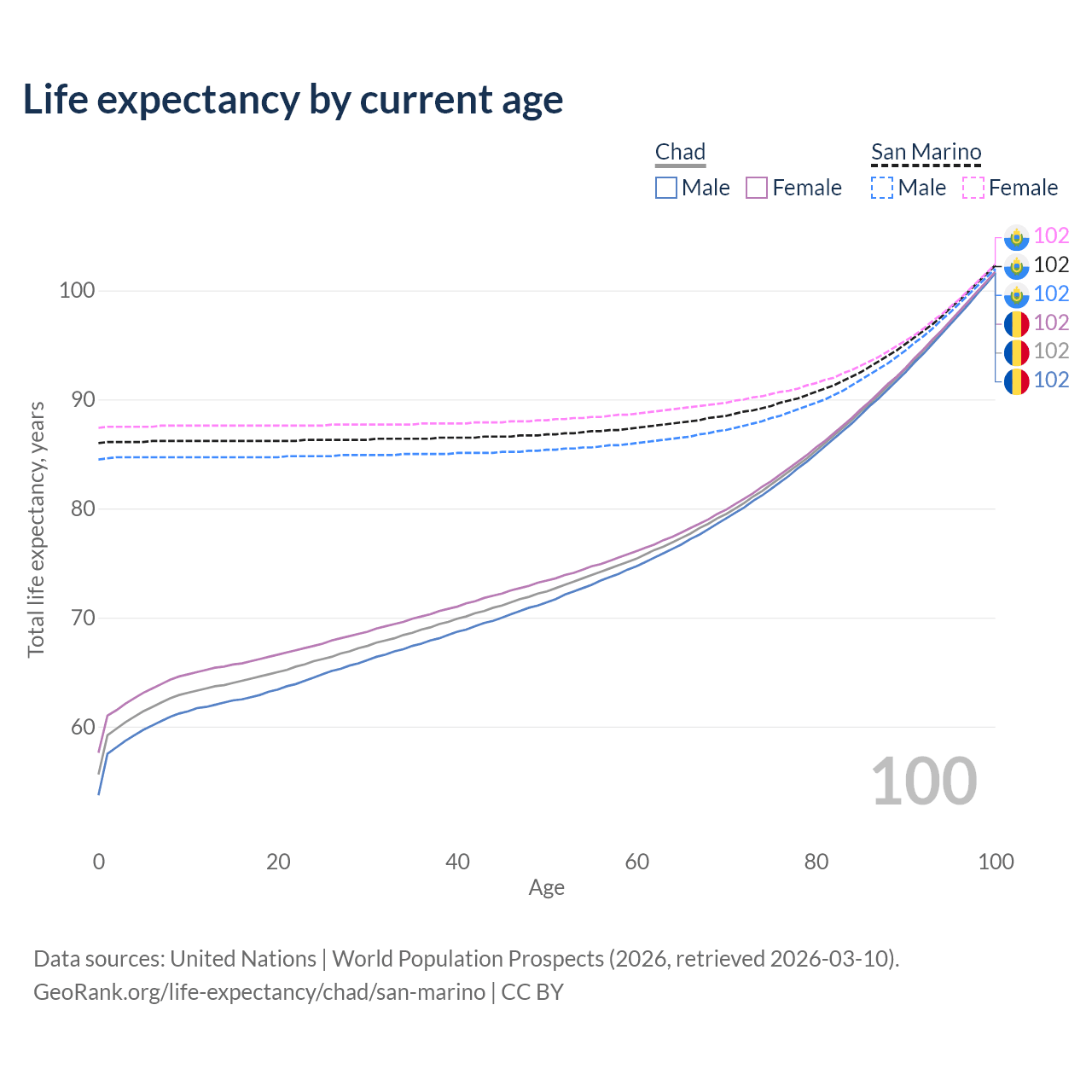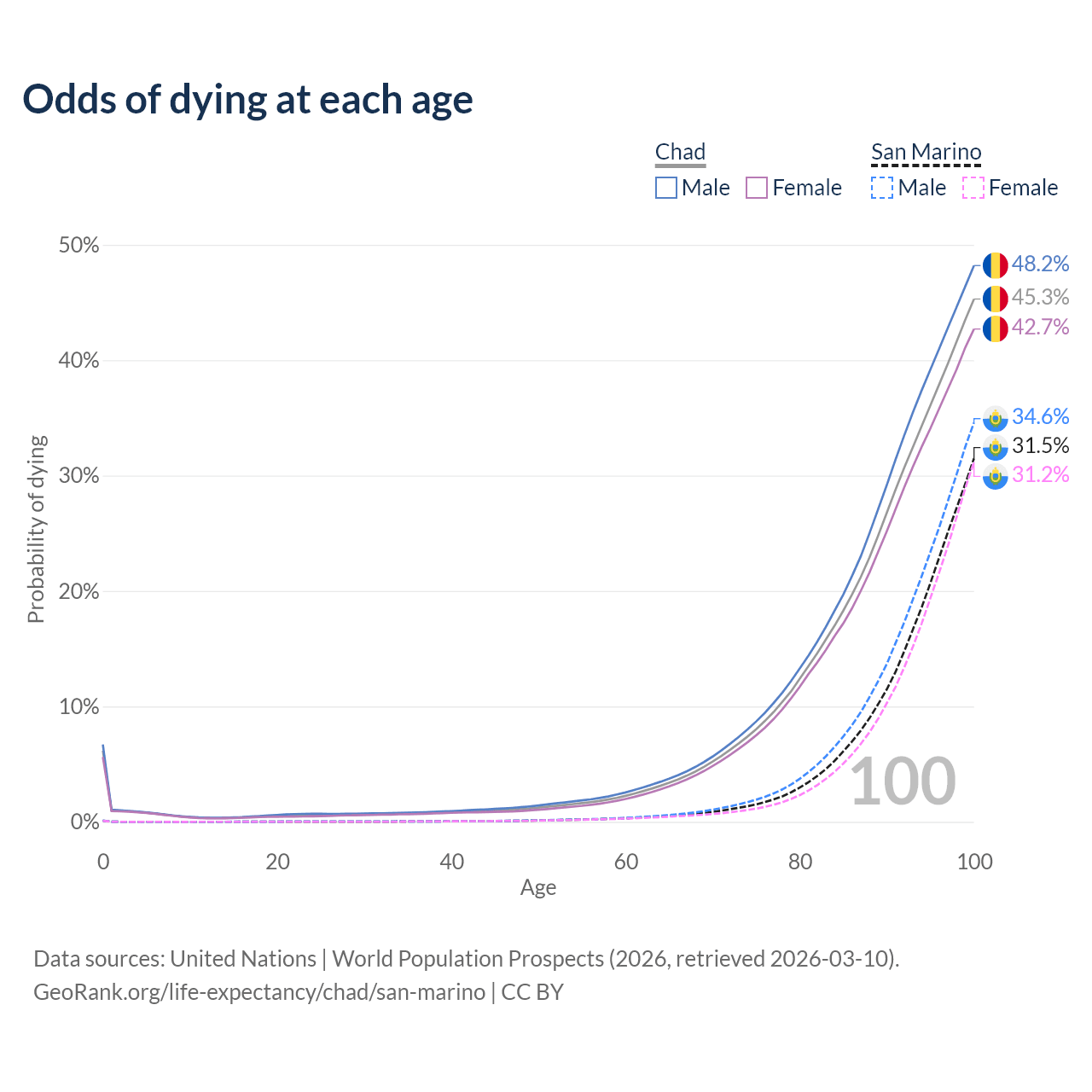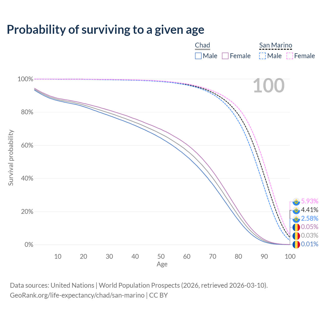 This life expectancy calculator shows the odds of living to 100, 95, 90, and below based on current age for both males and females in Chad and San Marino, along with mean and median age of death. The calculations are based on the 2026 life tables (actuarial tables) from the UN World Population Prospects.