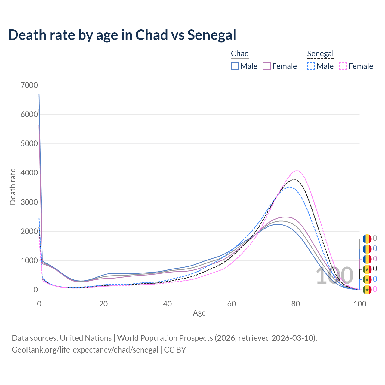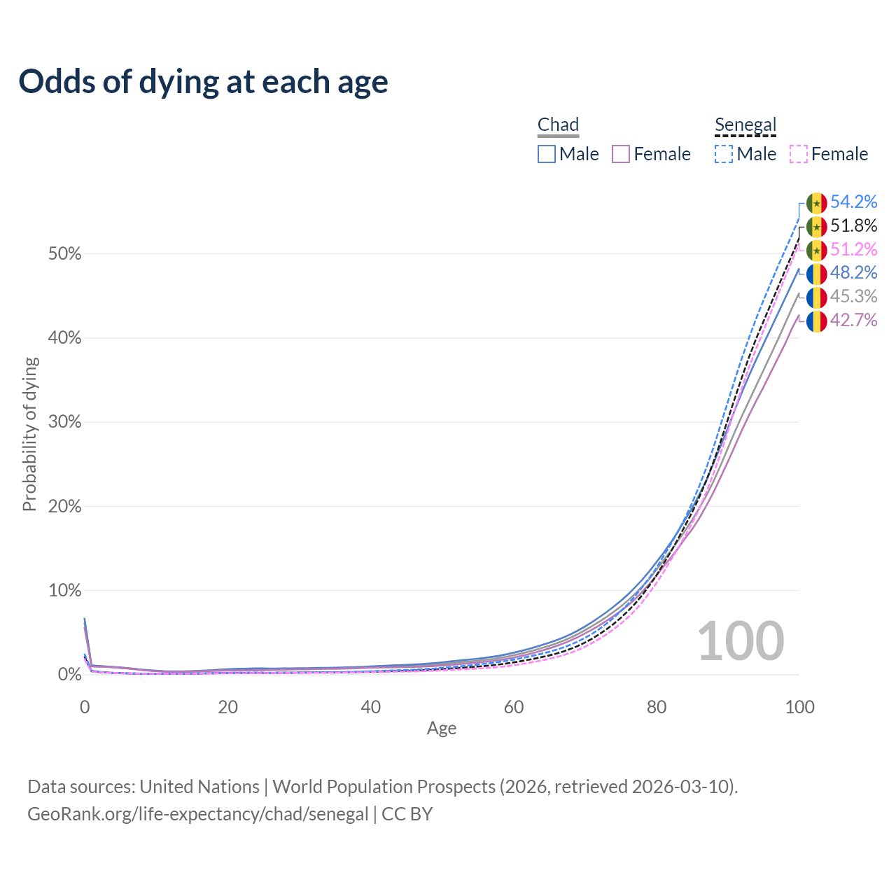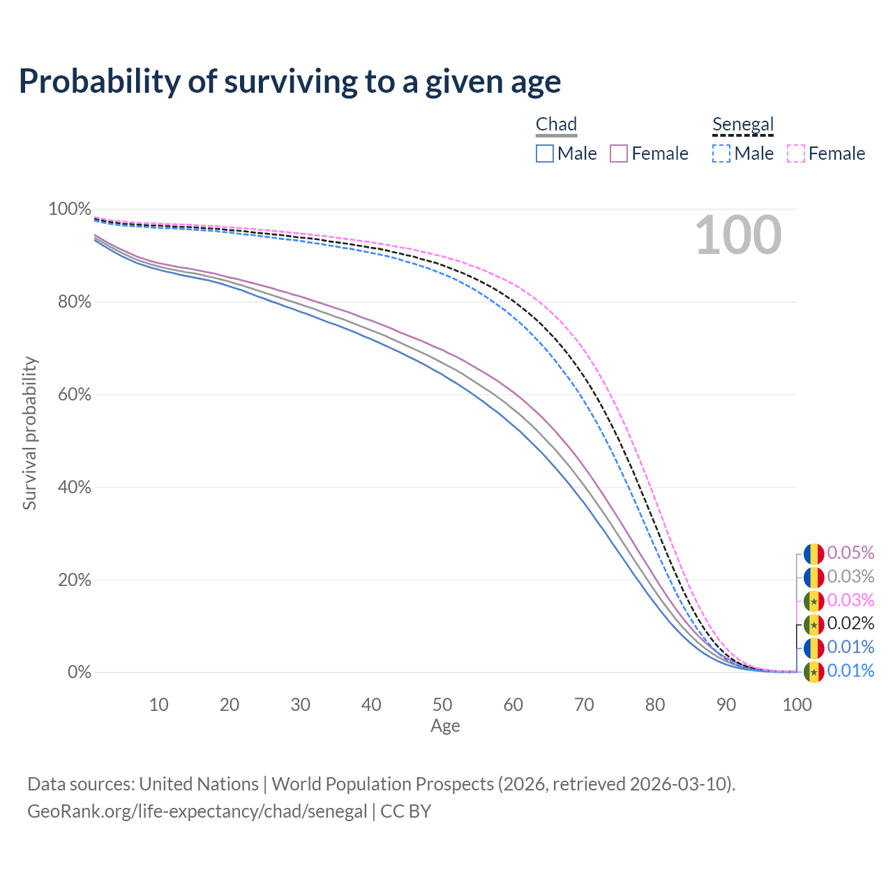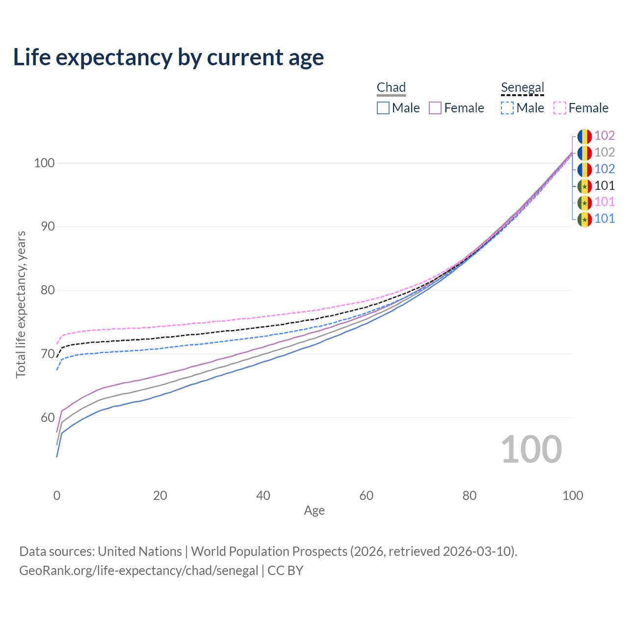 This life expectancy calculator shows the odds of living to 100, 95, 90, and below based on current age for both males and females in Chad and Senegal, along with mean and median age of death. The calculations are based on the 2026 life tables (actuarial tables) from the UN World Population Prospects.