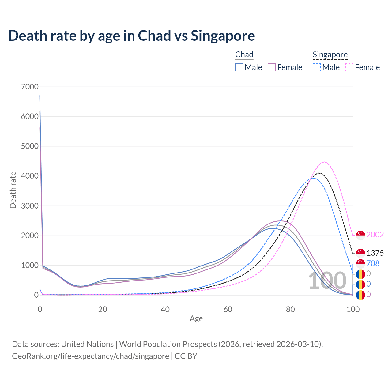In Chad, the most common age of death is 0, compared to 89 in Singapore. The median age of death is 64.8 in Chad and 86.5 in Singapore, meaning only half of each cohort is expected to live past that age.