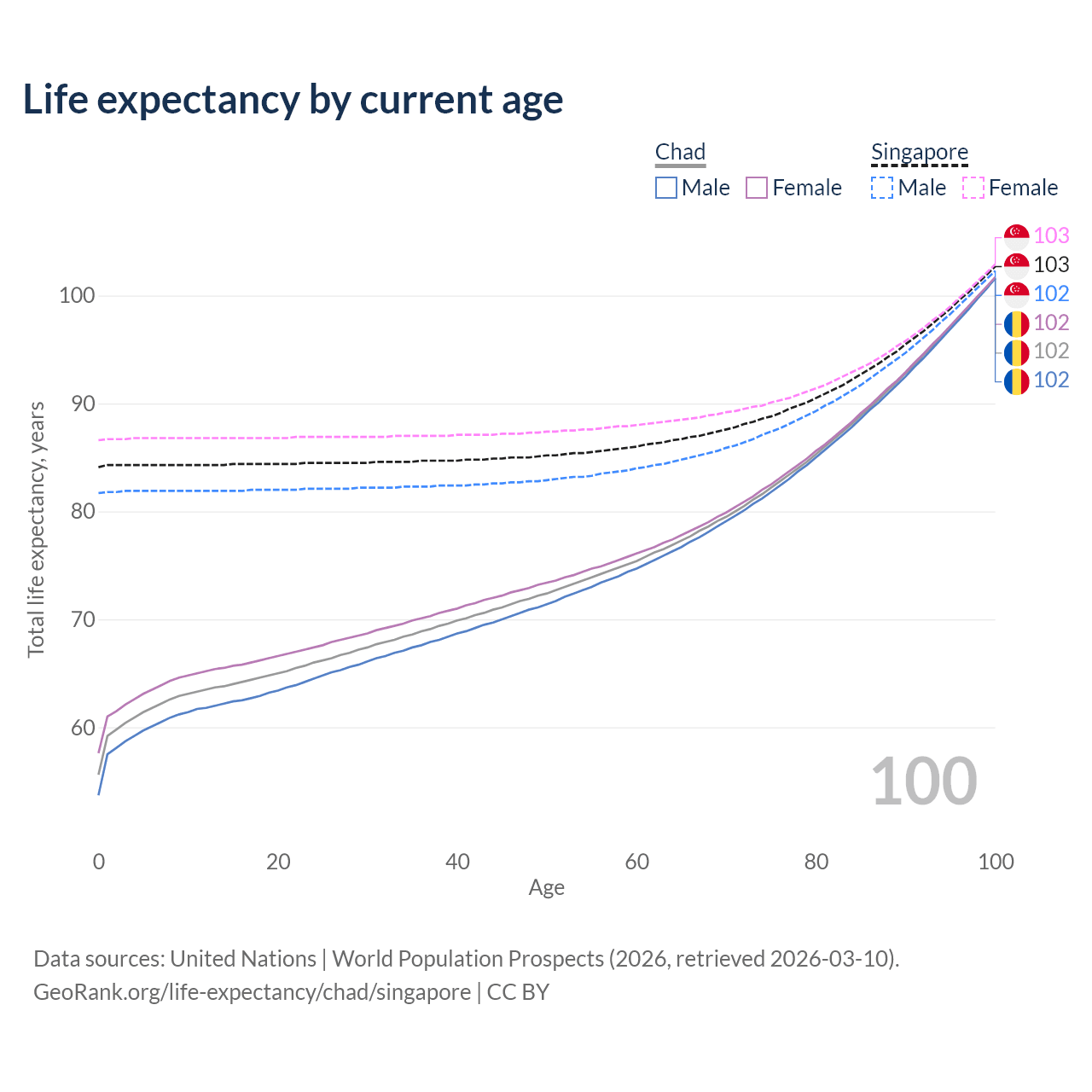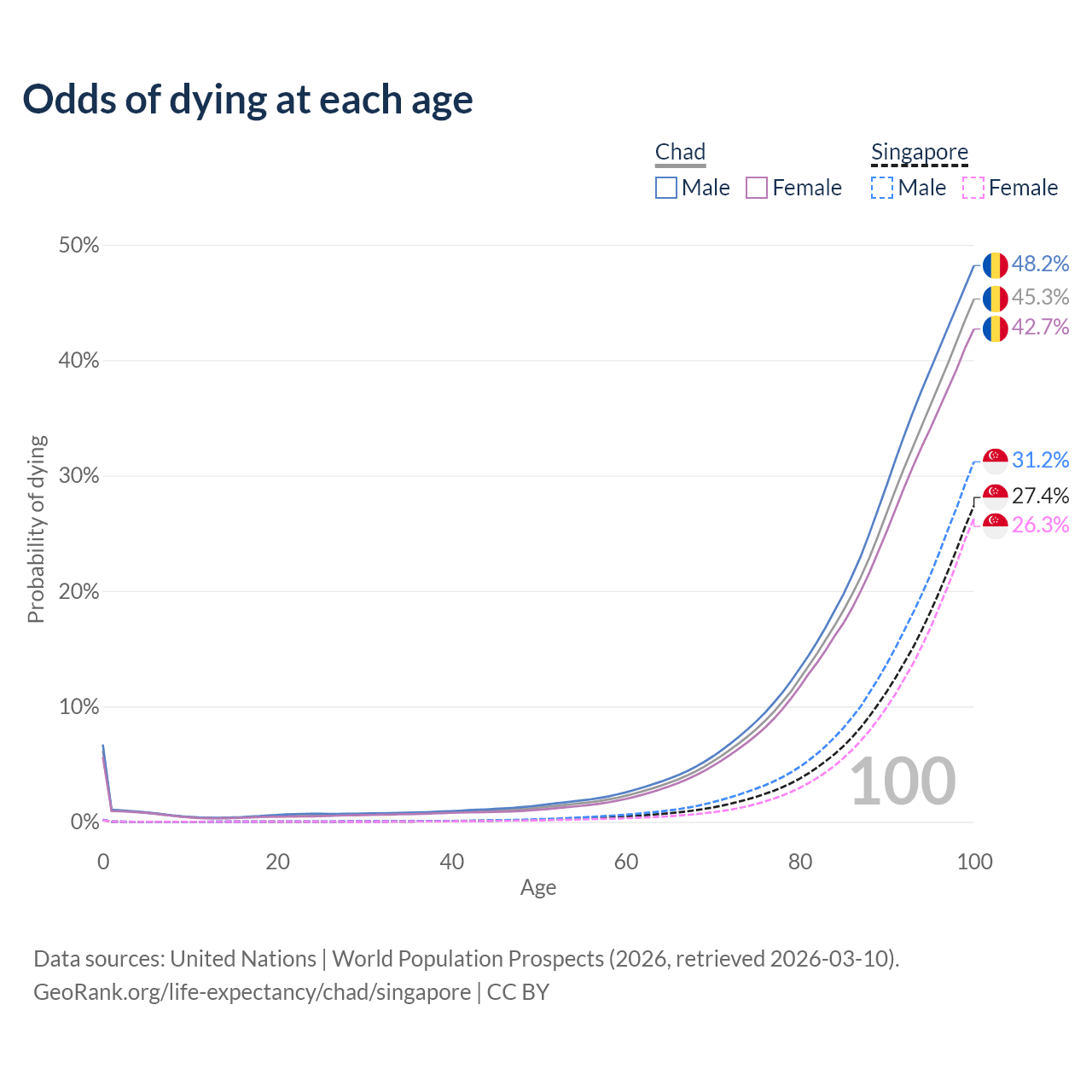 This life expectancy calculator shows the odds of living to 100, 95, 90, and below based on current age for both males and females in Chad and Singapore, along with mean and median age of death. The calculations are based on the 2026 life tables (actuarial tables) from the UN World Population Prospects.