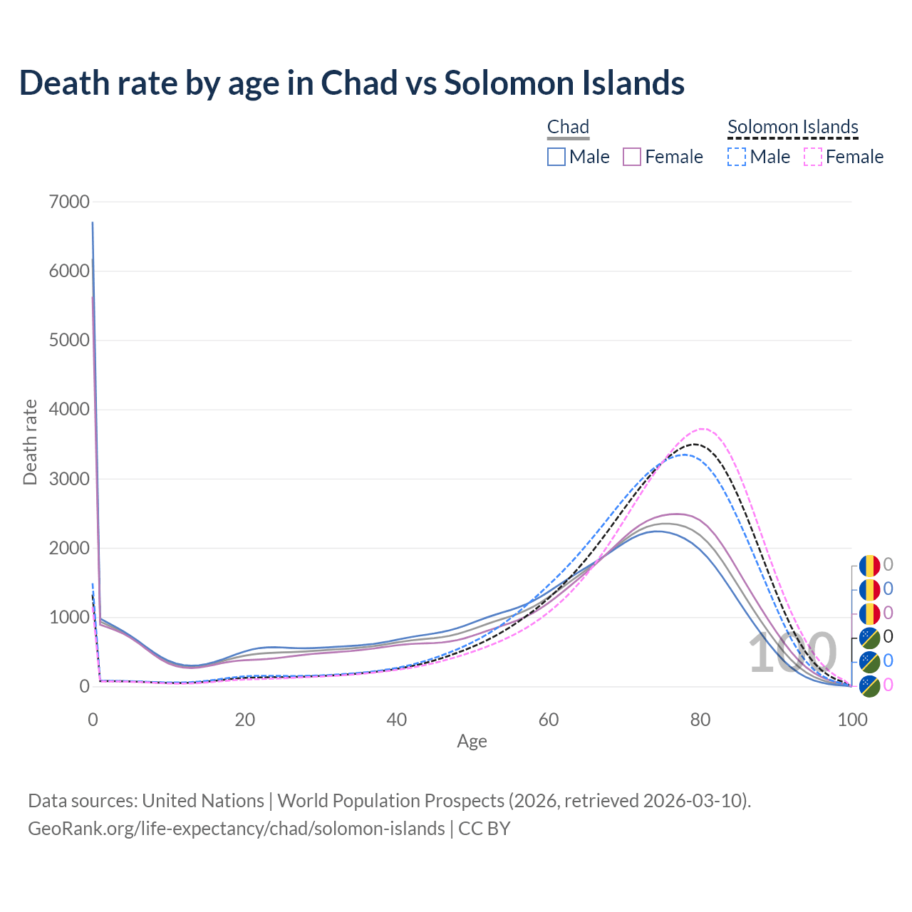 In Chad, the most common age of death is 0, compared to 79 in the Solomon Islands. The median age of death is 64.8 in Chad and 74.9 in the Solomon Islands, meaning only half of each cohort is expected to live past that age.