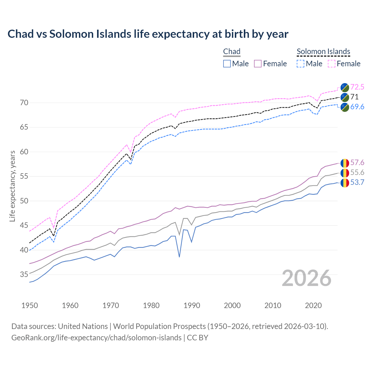 The average life expectancy at birth is 55.6 years in Chad vs 71 in the Solomon Islands. Chad is ranked 196/197 by life expectancy, and the Solomon Islands is 133/197. In Chad, the life expectancy is 53.7 years for males and 57.6 years for females. In the Solomon Islands, it's 69.6 years for males and 72.5 years for females.