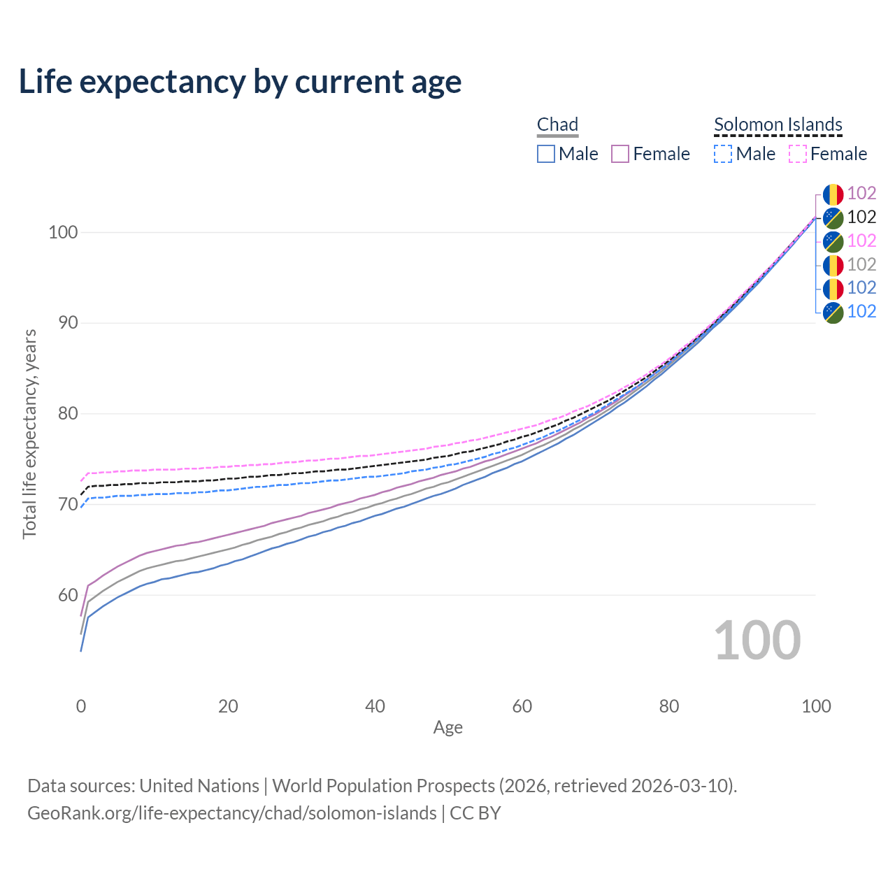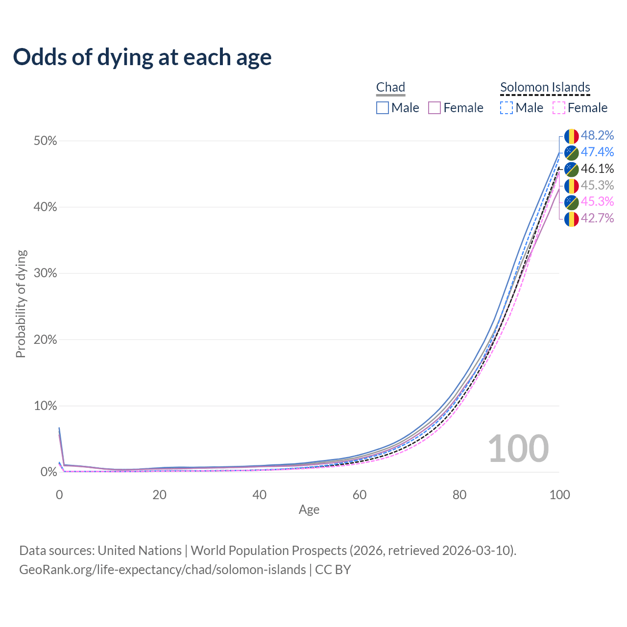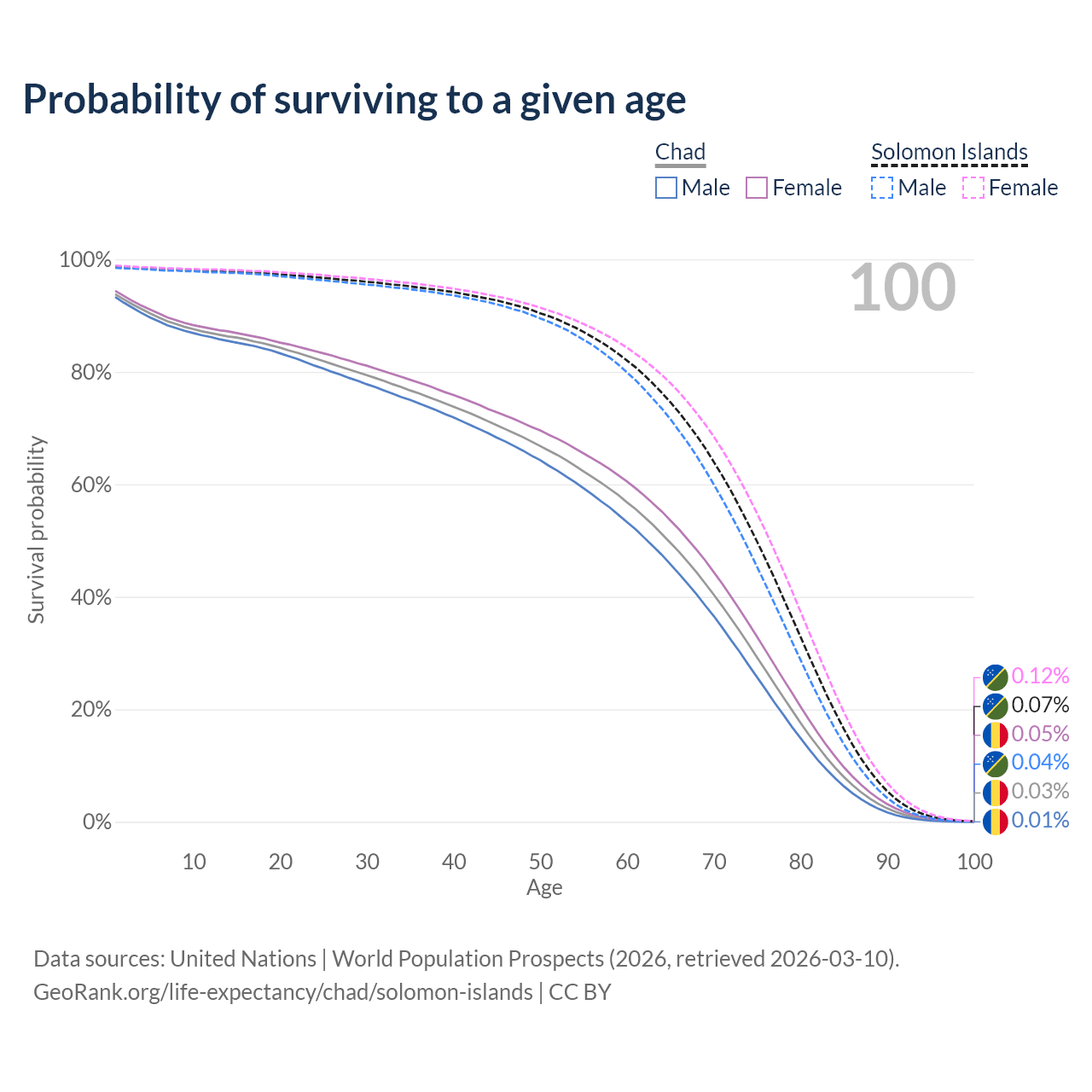This life expectancy calculator shows the odds of living to 100, 95, 90, and below based on current age for both males and females in Chad and the Solomon Islands, along with mean and median age of death. The calculations are based on the 2026 life tables (actuarial tables) from the UN World Population Prospects.