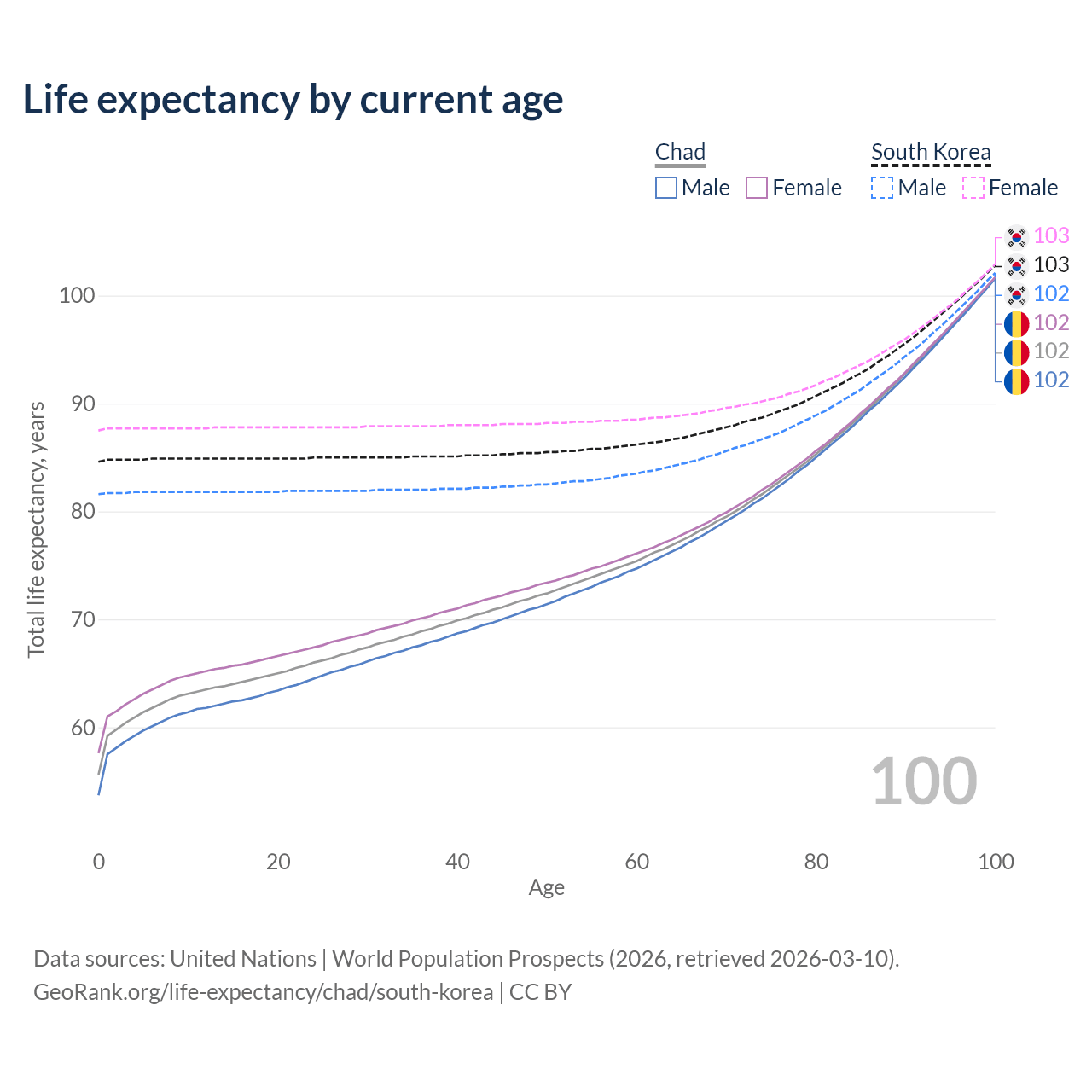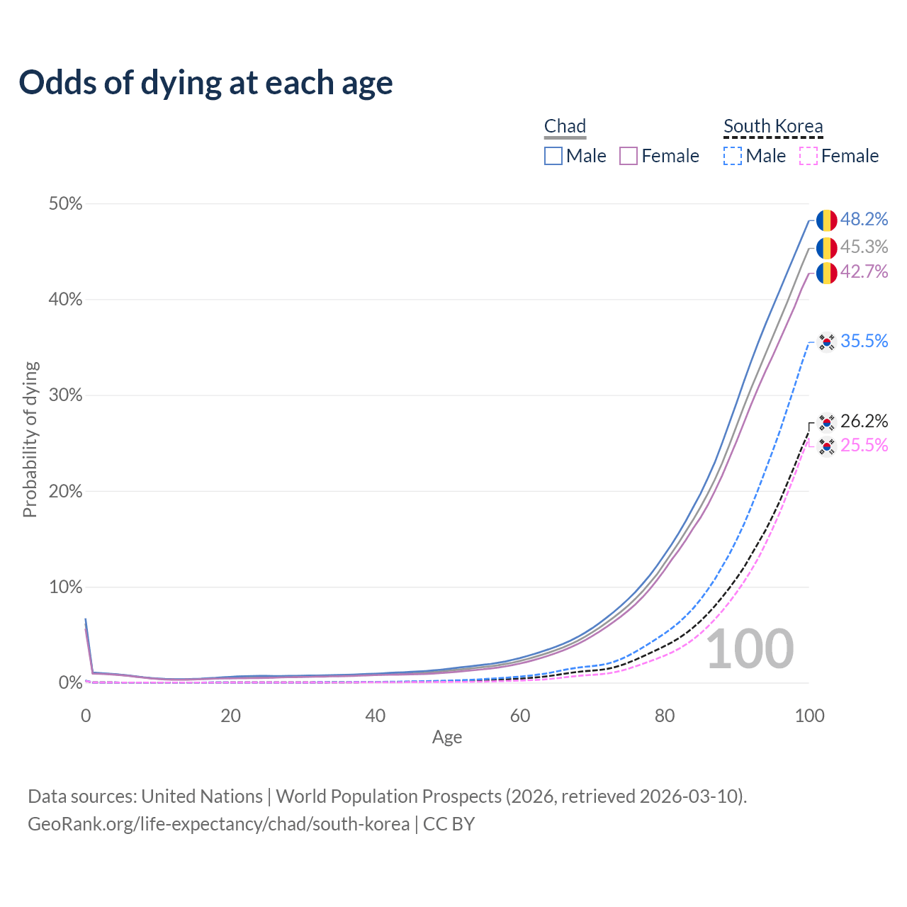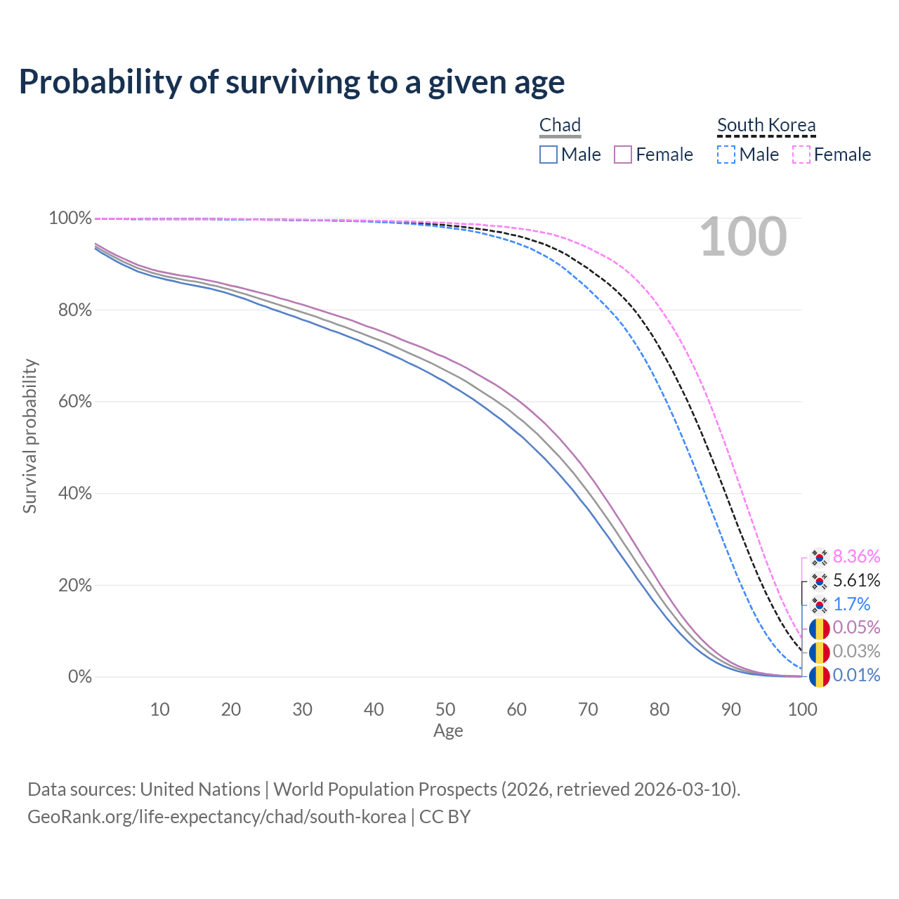 This life expectancy calculator shows the odds of living to 100, 95, 90, and below based on current age for both males and females in Chad and South Korea, along with mean and median age of death. The calculations are based on the 2026 life tables (actuarial tables) from the UN World Population Prospects.