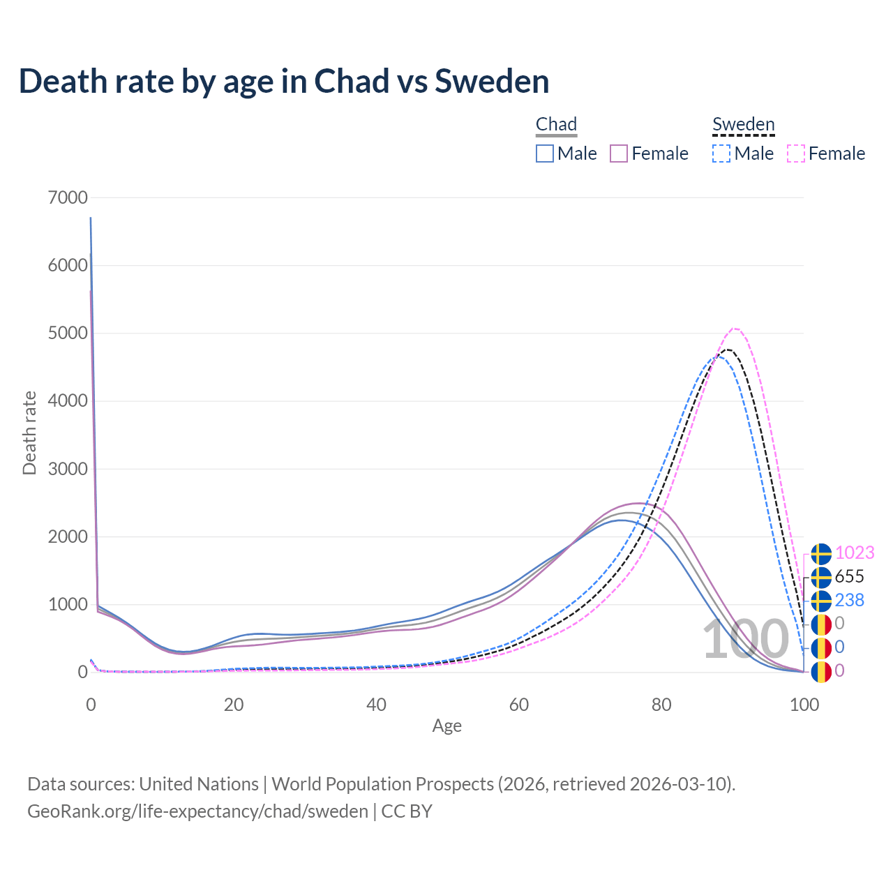 The average life expectancy at birth is 55.6 years in Chad vs 83.7 in Sweden. Chad is ranked 196/197 by life expectancy, and Sweden is 14/197. In Chad, the life expectancy is 53.7 years for males and 57.6 years for females. In Sweden, it's 82 years for males and 85.5 years for females.