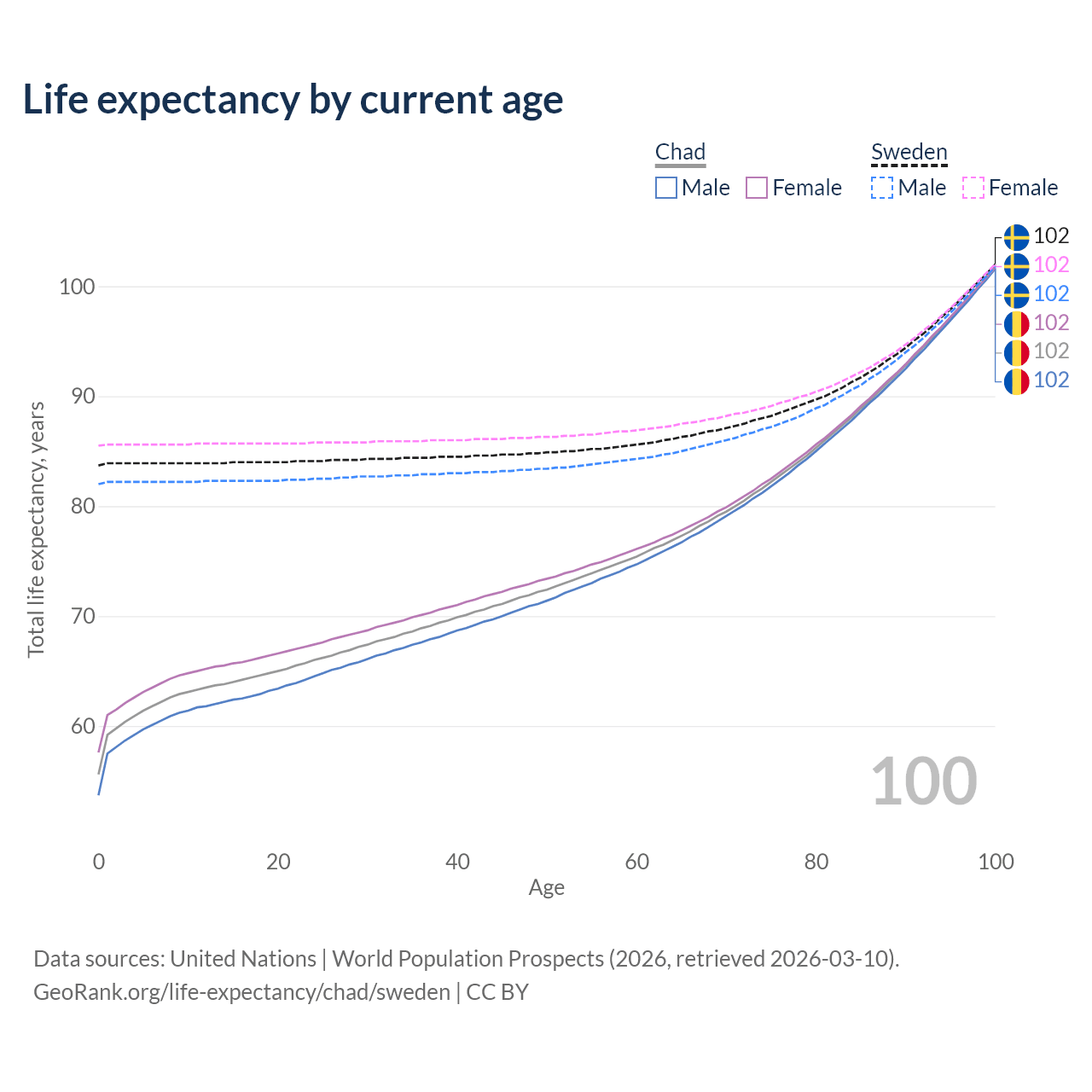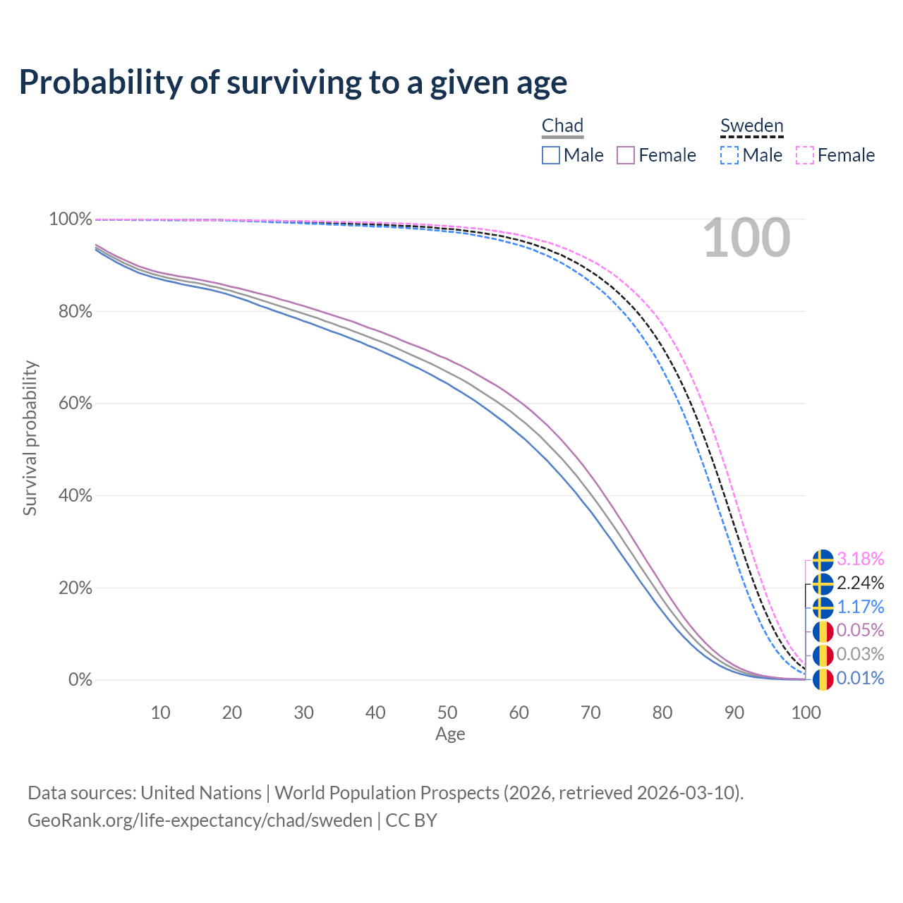This life expectancy calculator shows the odds of living to 100, 95, 90, and below based on current age for both males and females in Chad and Sweden, along with mean and median age of death. The calculations are based on the 2026 life tables (actuarial tables) from the UN World Population Prospects.