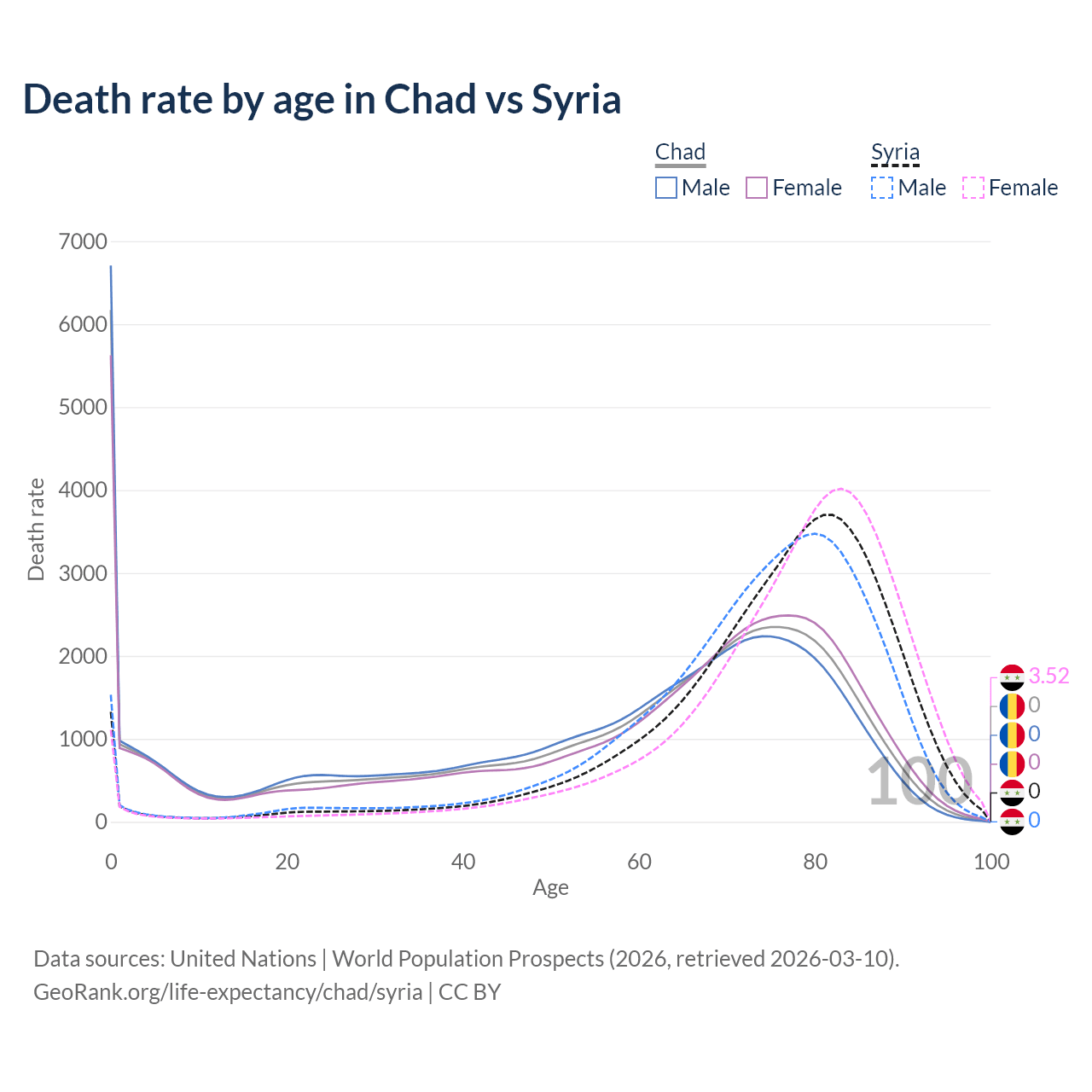 The average life expectancy at birth is 55.6 years in Chad vs 73.4 in Syria. Chad is ranked 196/197 by life expectancy, and Syria is 108/197. In Chad, the life expectancy is 53.7 years for males and 57.6 years for females. In Syria, it's 71 years for males and 75.9 years for females.