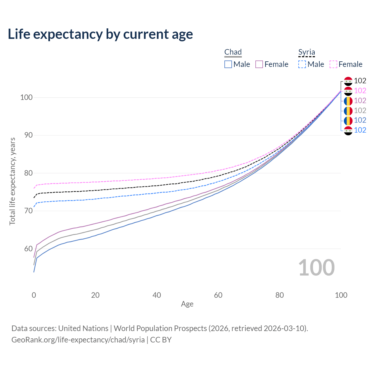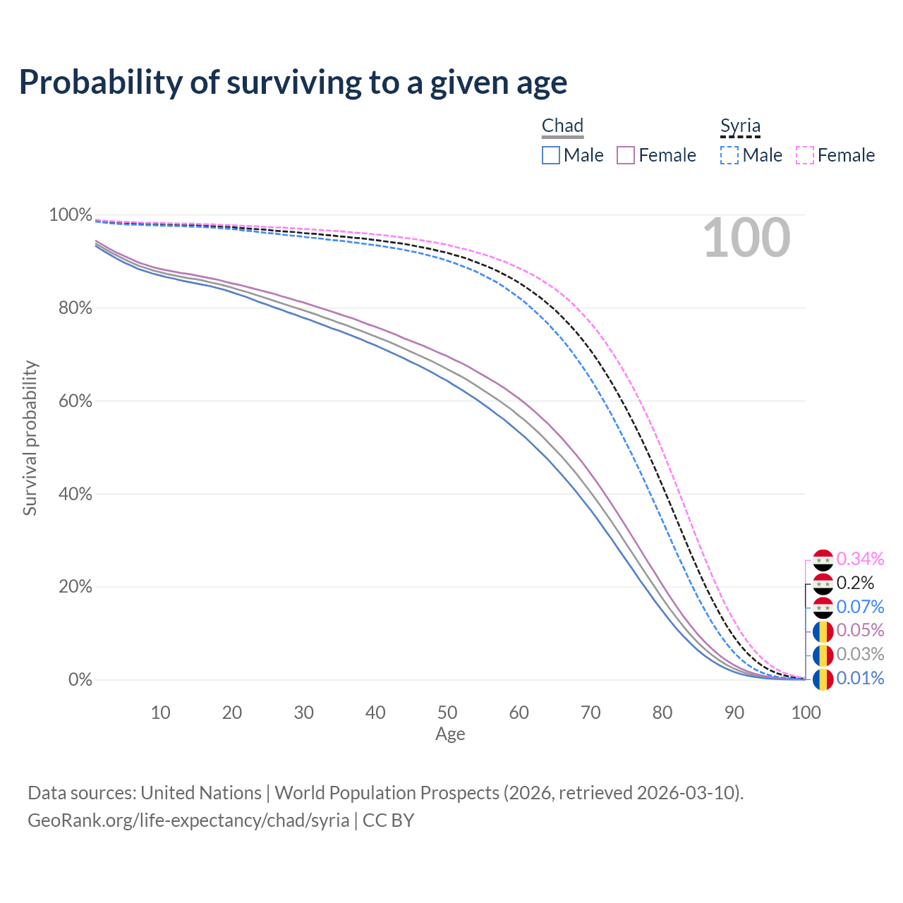 This life expectancy calculator shows the odds of living to 100, 95, 90, and below based on current age for both males and females in Chad and Syria, along with mean and median age of death. The calculations are based on the 2026 life tables (actuarial tables) from the UN World Population Prospects.