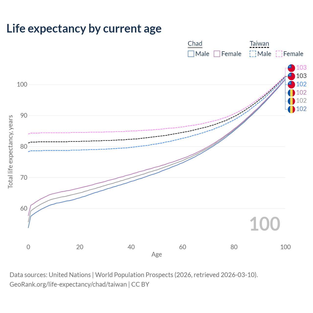 The average life expectancy at birth is 55.6 years in Chad vs 81.1 in Taiwan. Chad is ranked 196/197 by life expectancy, and Taiwan is 40/197. In Chad, the life expectancy is 53.7 years for males and 57.6 years for females. In Taiwan, it's 78.3 years for males and 84 years for females.