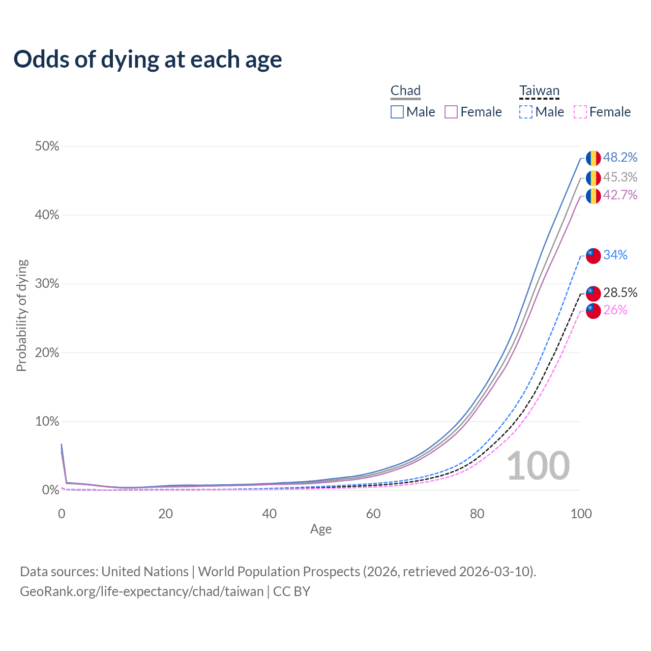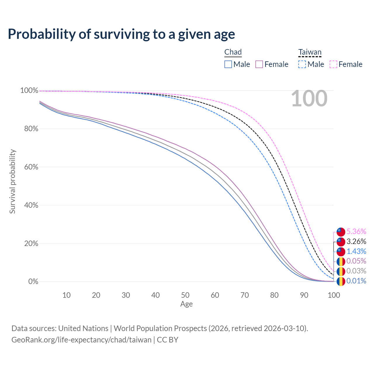 This life expectancy calculator shows the odds of living to 100, 95, 90, and below based on current age for both males and females in Chad and Taiwan, along with mean and median age of death. The calculations are based on the 2026 life tables (actuarial tables) from the UN World Population Prospects.