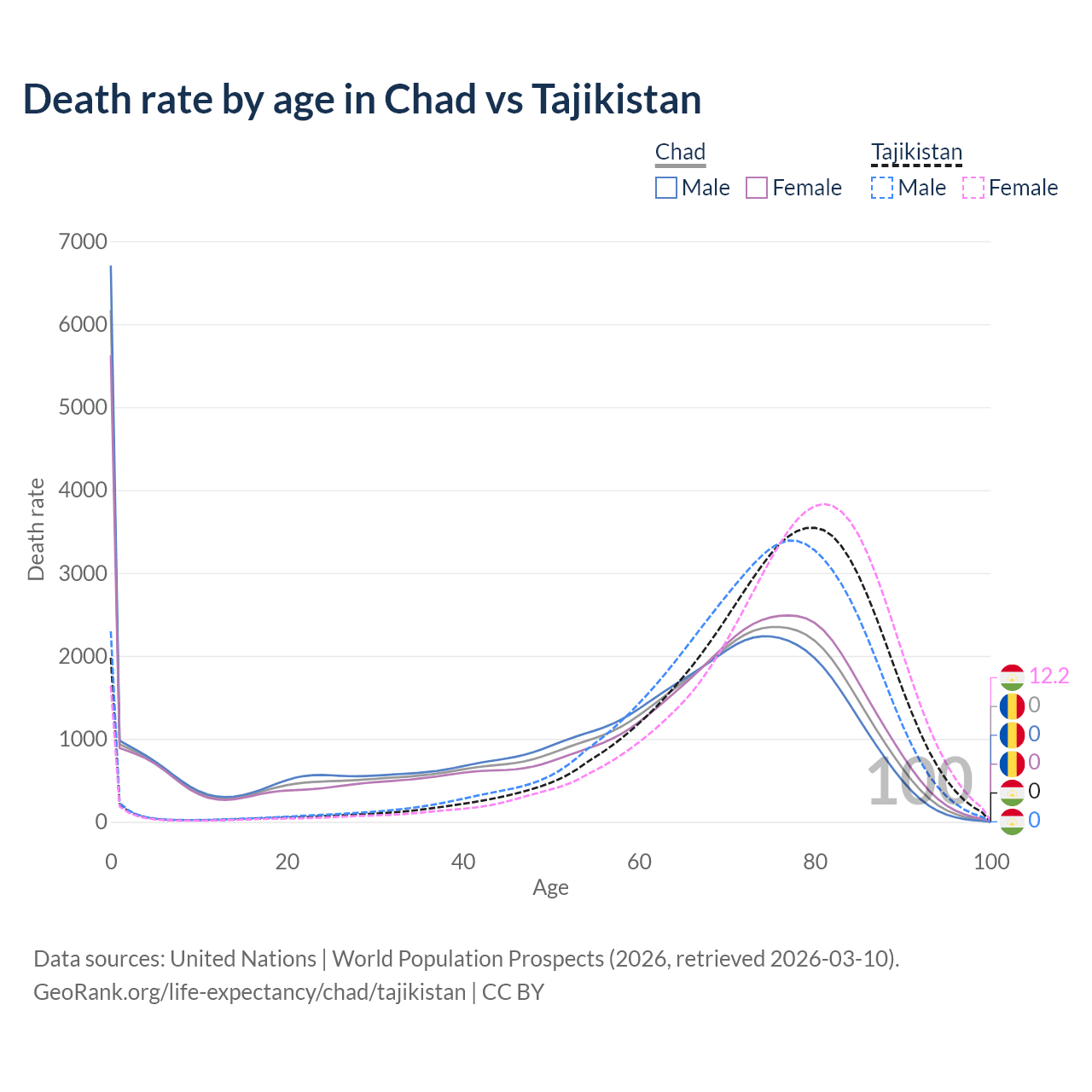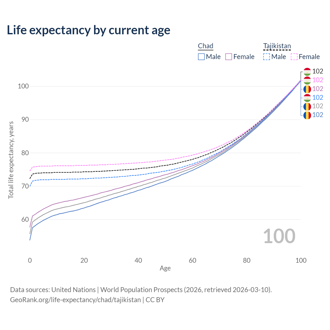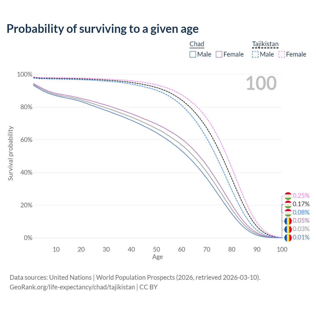 This life expectancy calculator shows the odds of living to 100, 95, 90, and below based on current age for both males and females in Chad and Tajikistan, along with mean and median age of death. The calculations are based on the 2026 life tables (actuarial tables) from the UN World Population Prospects.