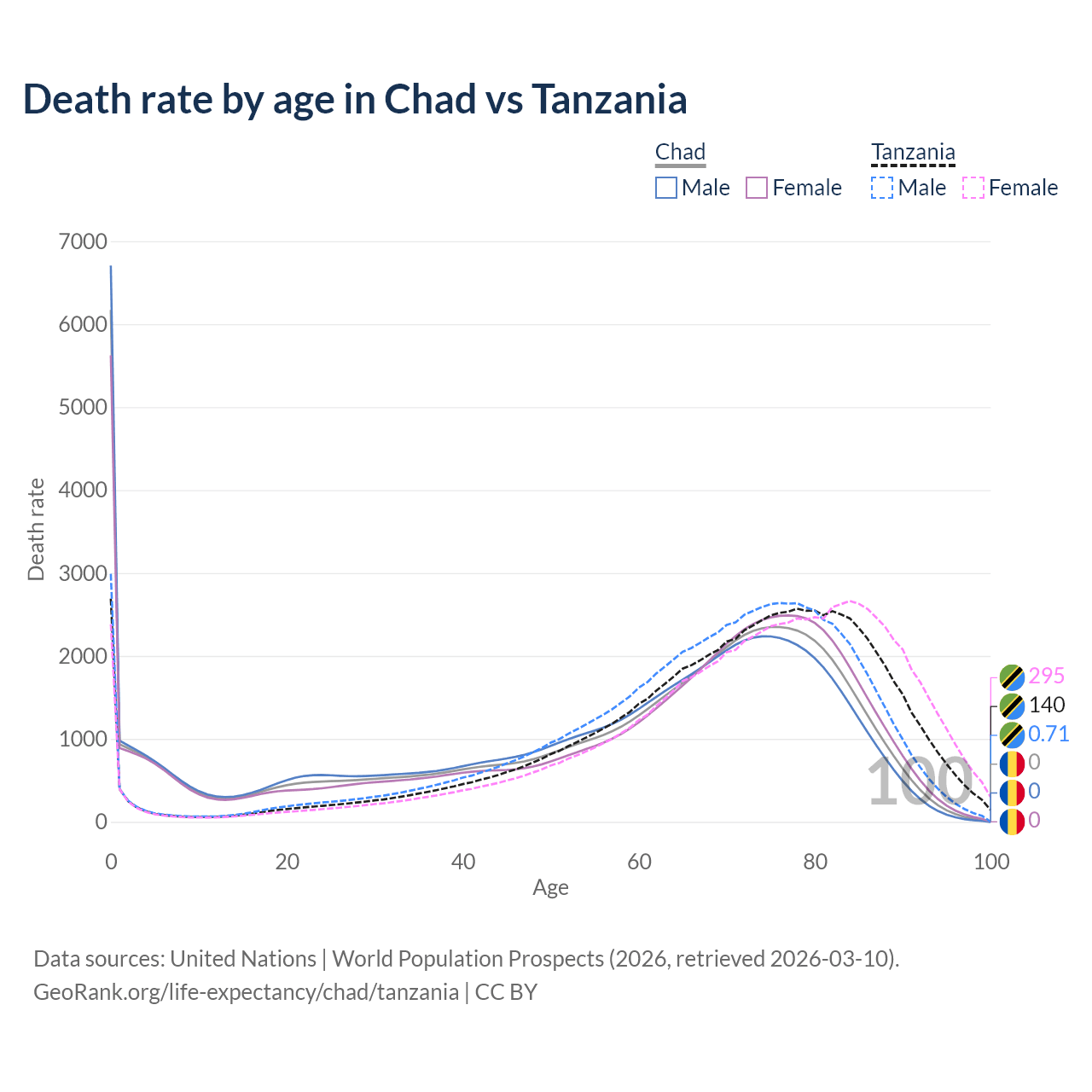 The average life expectancy at birth is 55.6 years in Chad vs 67.6 in Tanzania. Chad is ranked 196/197 by life expectancy, and Tanzania is 155/197. In Chad, the life expectancy is 53.7 years for males and 57.6 years for females. In Tanzania, it's 64.8 years for males and 70.4 years for females.