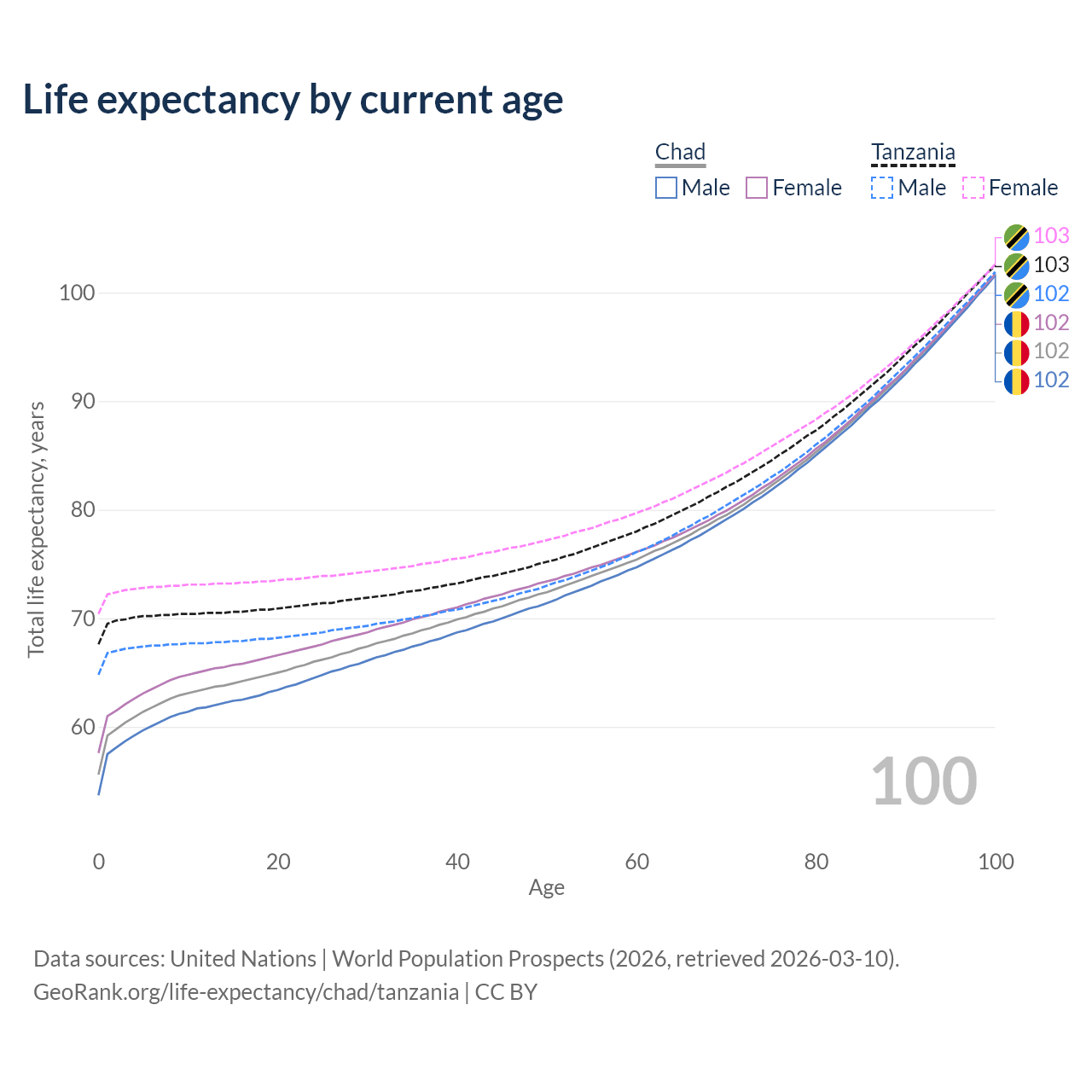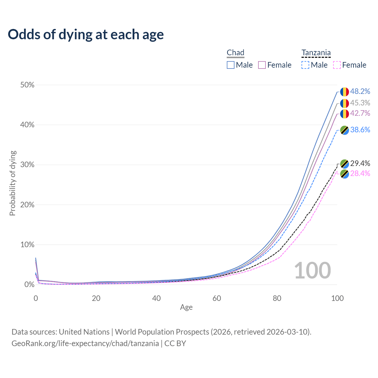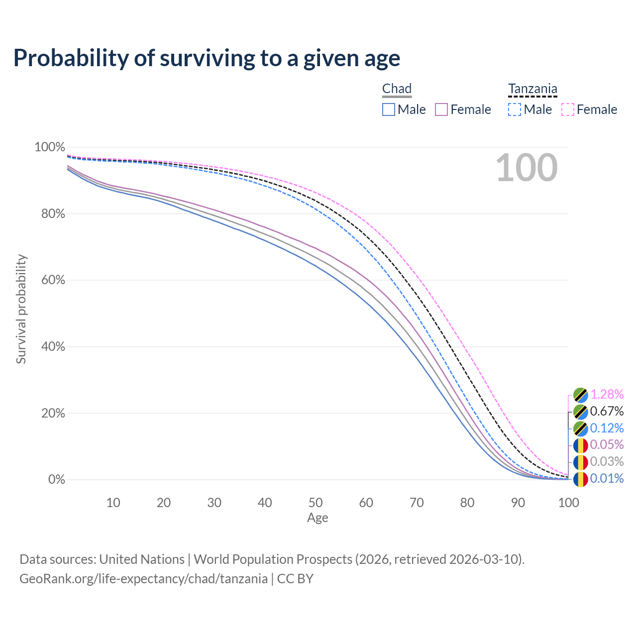 This life expectancy calculator shows the odds of living to 100, 95, 90, and below based on current age for both males and females in Chad and Tanzania, along with mean and median age of death. The calculations are based on the 2026 life tables (actuarial tables) from the UN World Population Prospects.