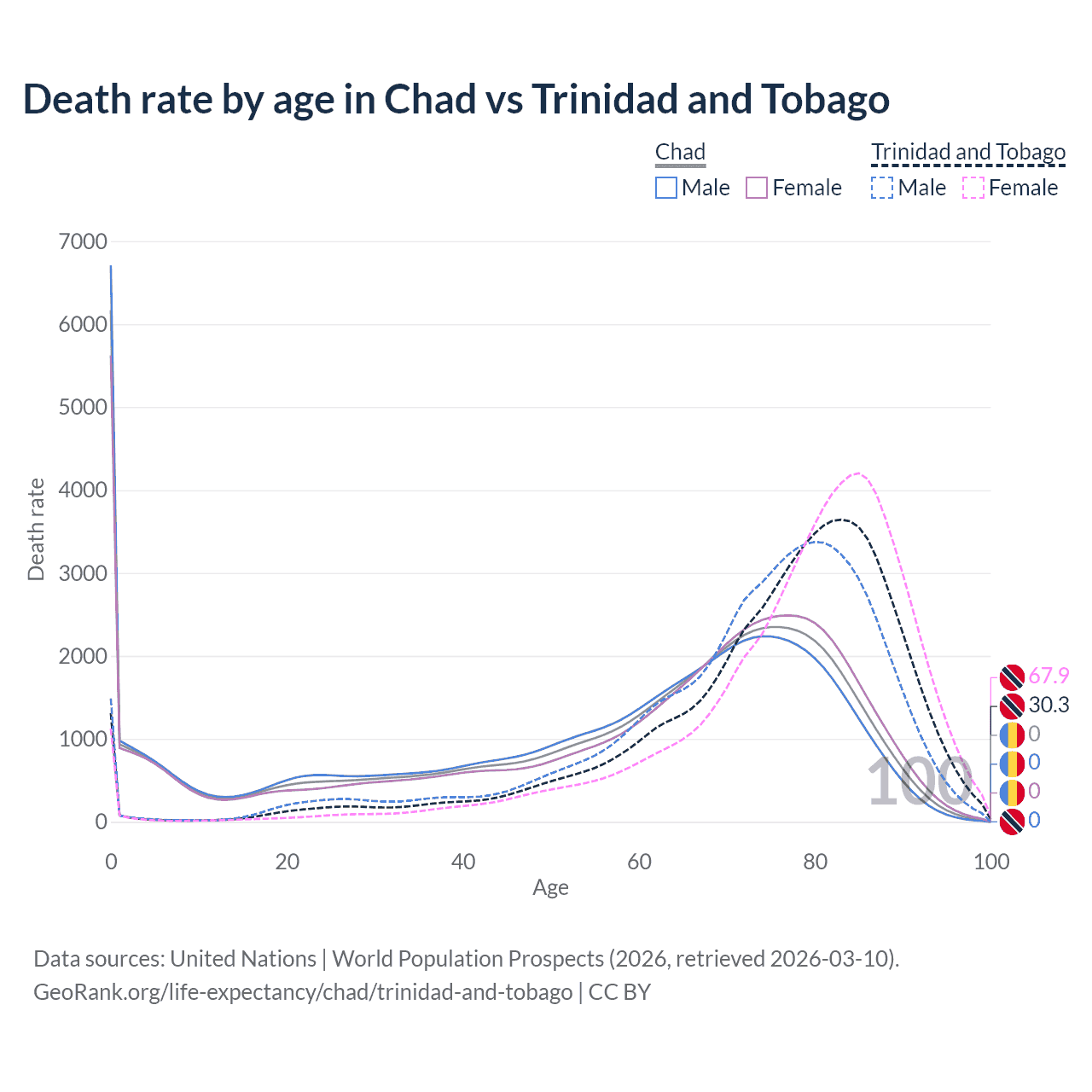 In Chad, the most common age of death is 0, compared to 83 in Trinidad and Tobago. The median age of death is 64.8 in Chad and 78.4 in Trinidad and Tobago, meaning only half of each cohort is expected to live past that age.