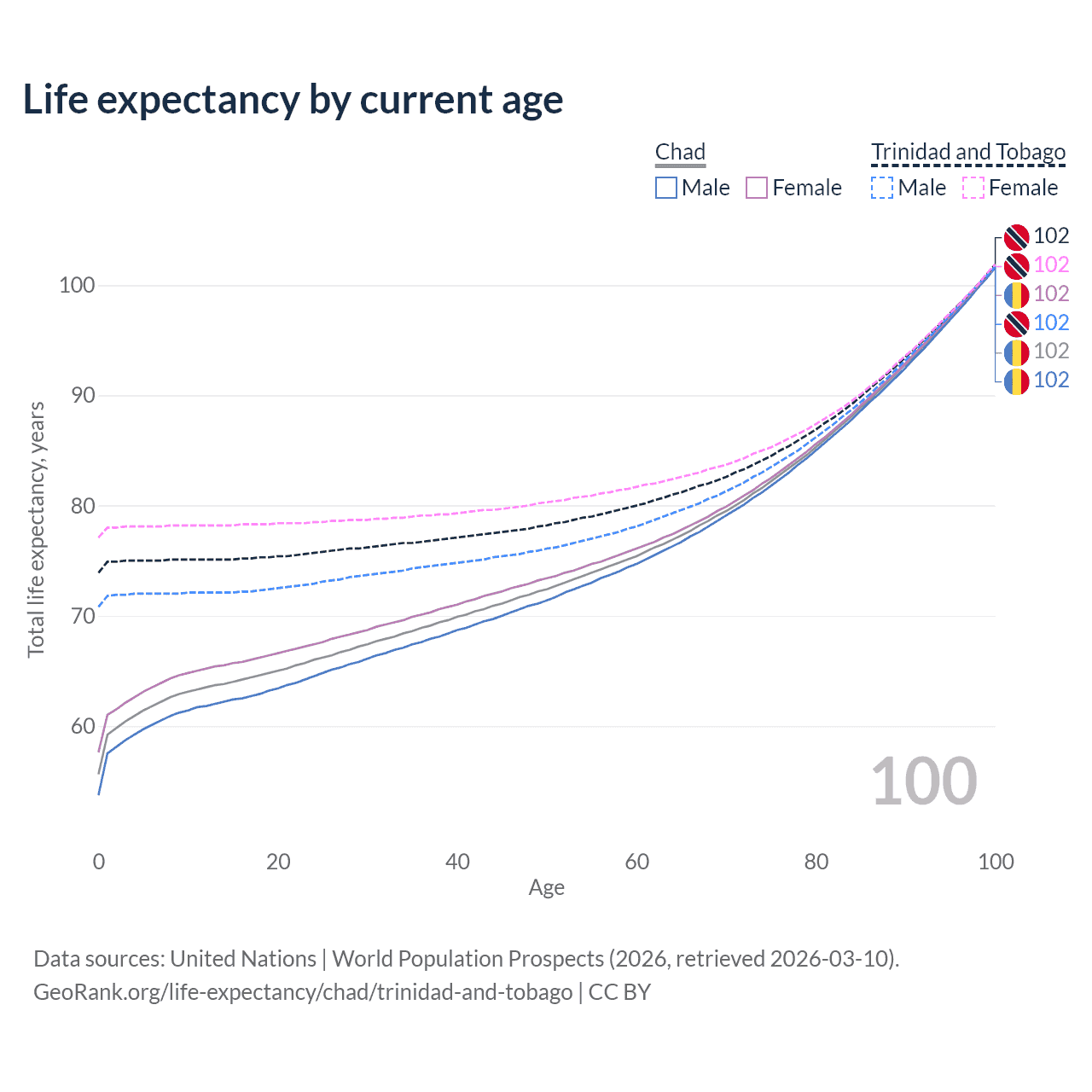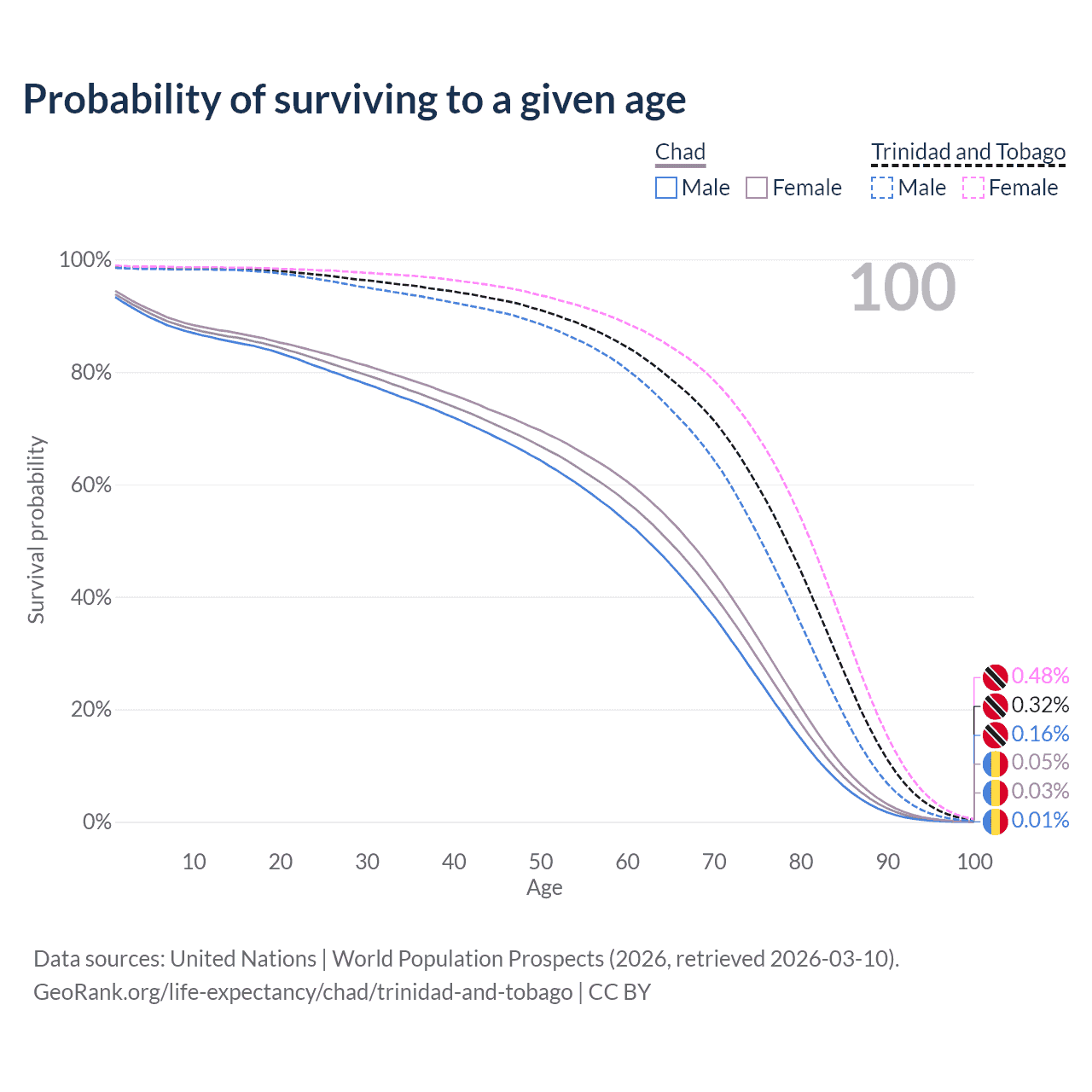 This life expectancy calculator shows the odds of living to 100, 95, 90, and below based on current age for both males and females in Chad and Trinidad and Tobago, along with mean and median age of death. The calculations are based on the 2026 life tables (actuarial tables) from the UN World Population Prospects.