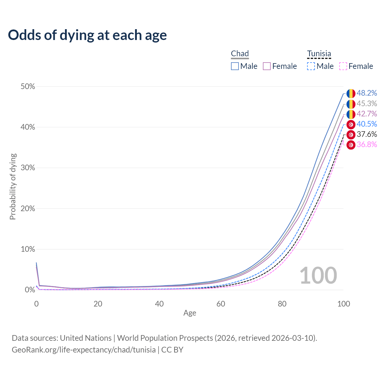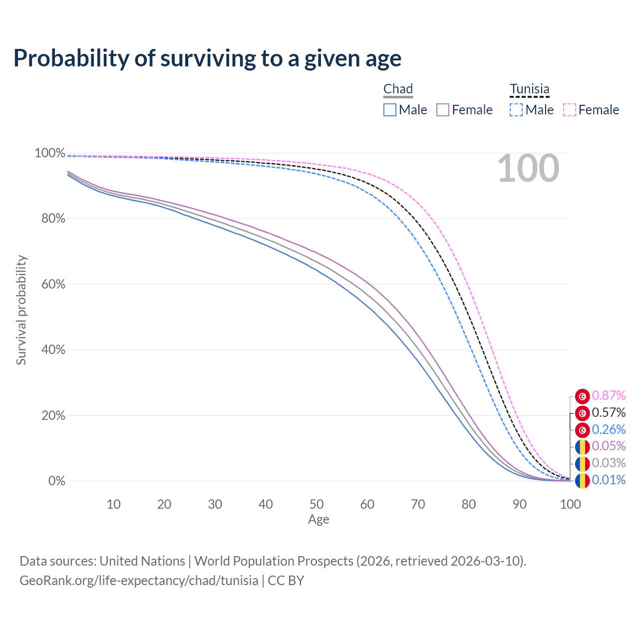 This life expectancy calculator shows the odds of living to 100, 95, 90, and below based on current age for both males and females in Chad and Tunisia, along with mean and median age of death. The calculations are based on the 2026 life tables (actuarial tables) from the UN World Population Prospects.