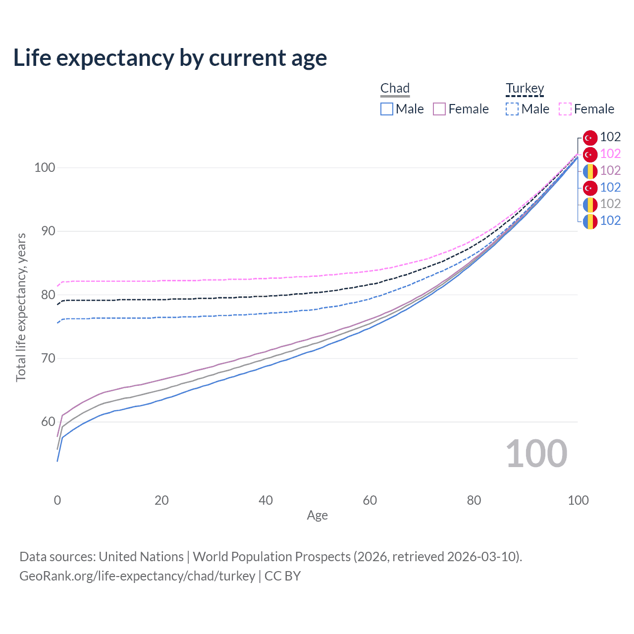 This life expectancy calculator shows the odds of living to 100, 95, 90, and below based on current age for both males and females in Chad and Turkey, along with mean and median age of death. The calculations are based on the 2026 life tables (actuarial tables) from the UN World Population Prospects.