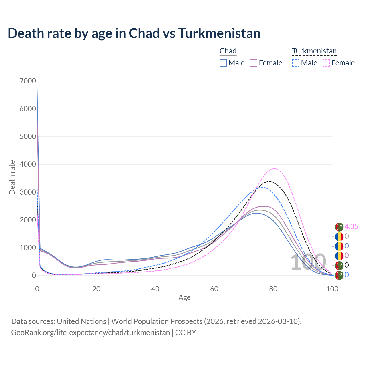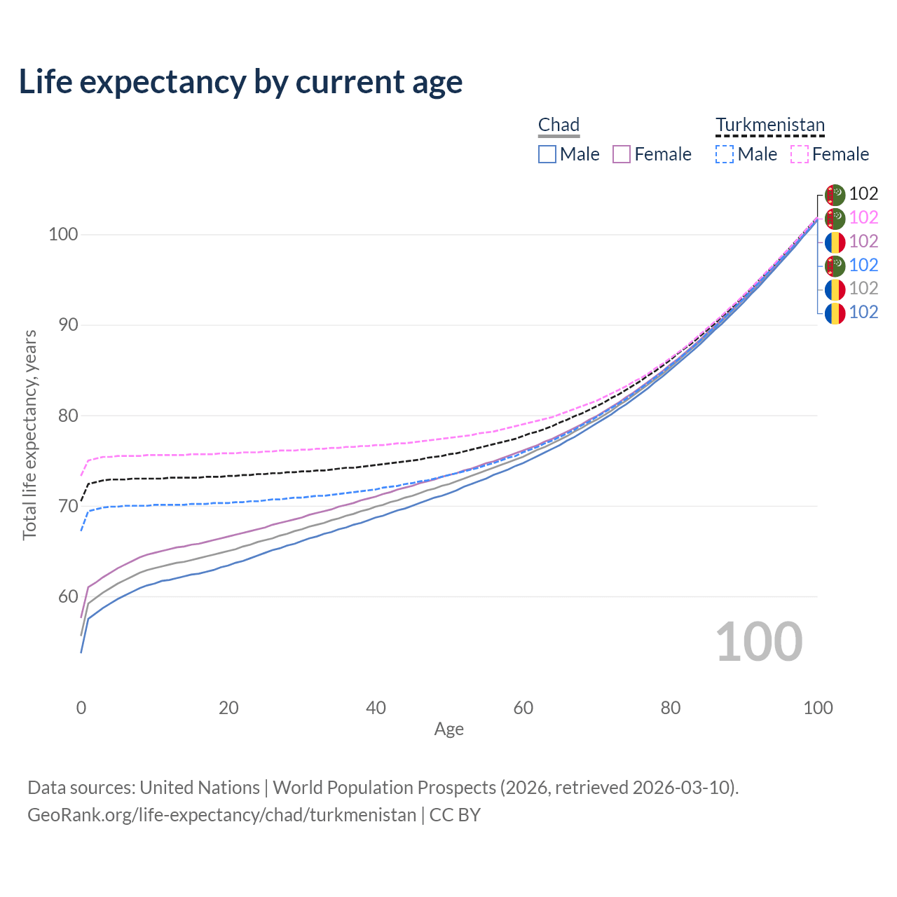 This life expectancy calculator shows the odds of living to 100, 95, 90, and below based on current age for both males and females in Chad and Turkmenistan, along with mean and median age of death. The calculations are based on the 2026 life tables (actuarial tables) from the UN World Population Prospects.