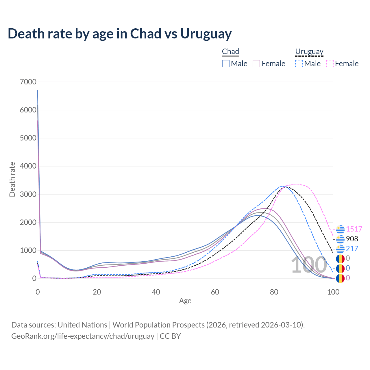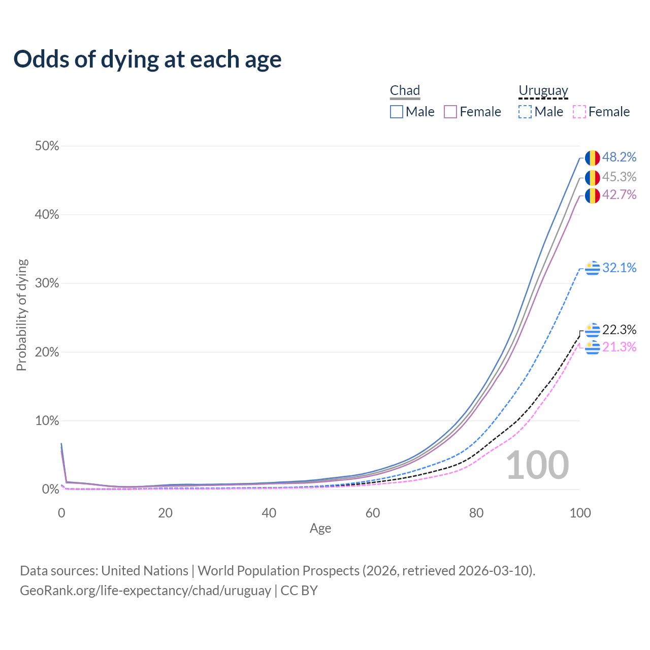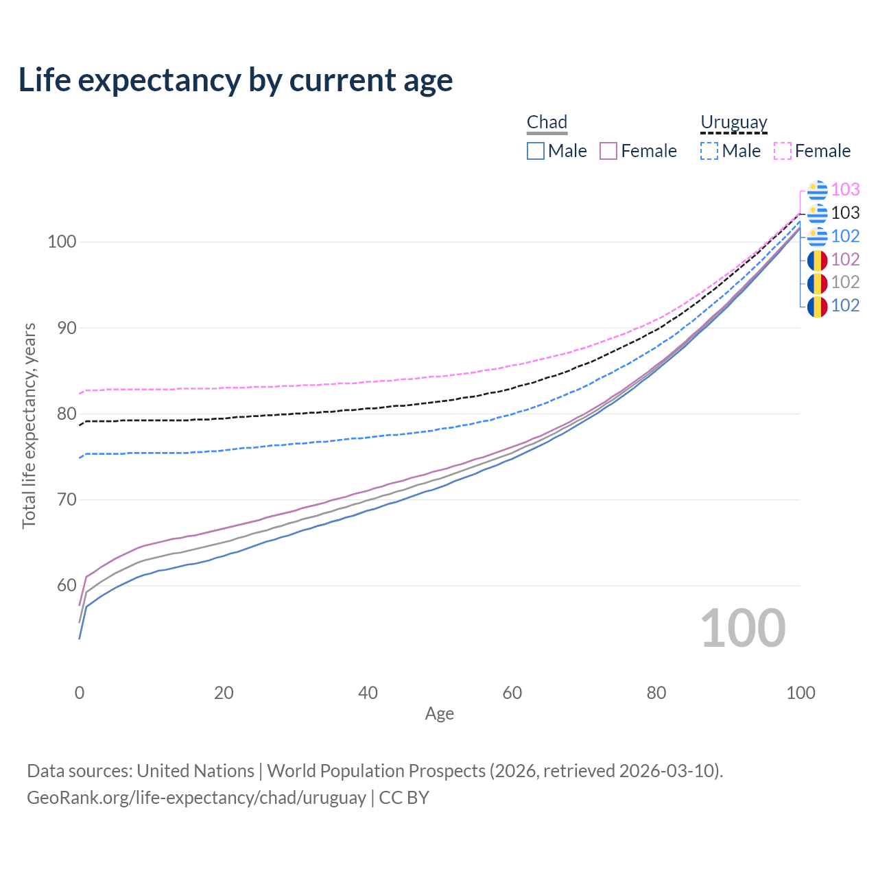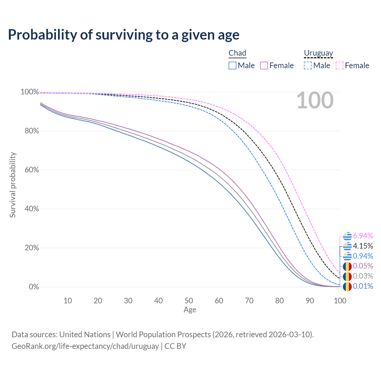 This life expectancy calculator shows the odds of living to 100, 95, 90, and below based on current age for both males and females in Chad and Uruguay, along with mean and median age of death. The calculations are based on the 2026 life tables (actuarial tables) from the UN World Population Prospects.