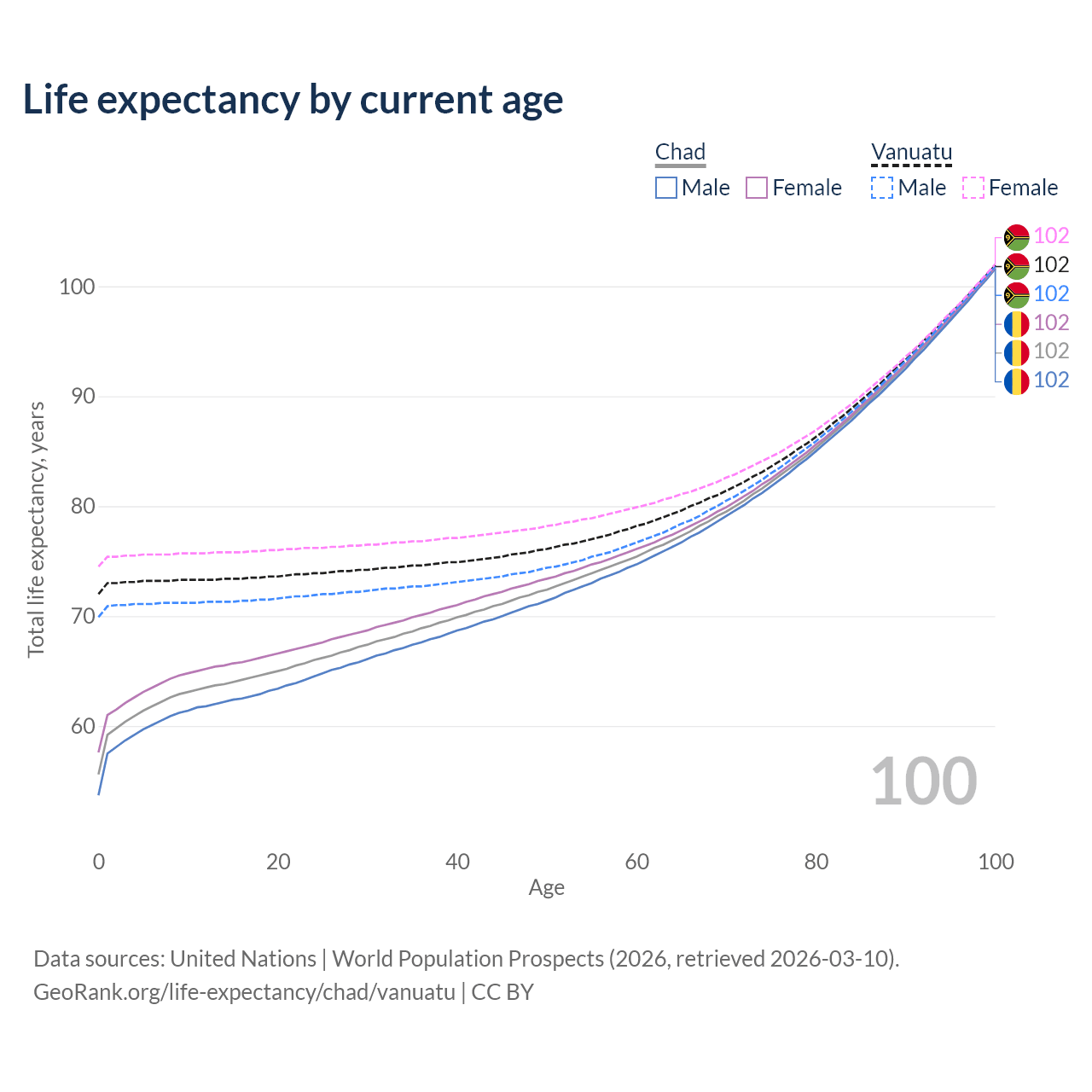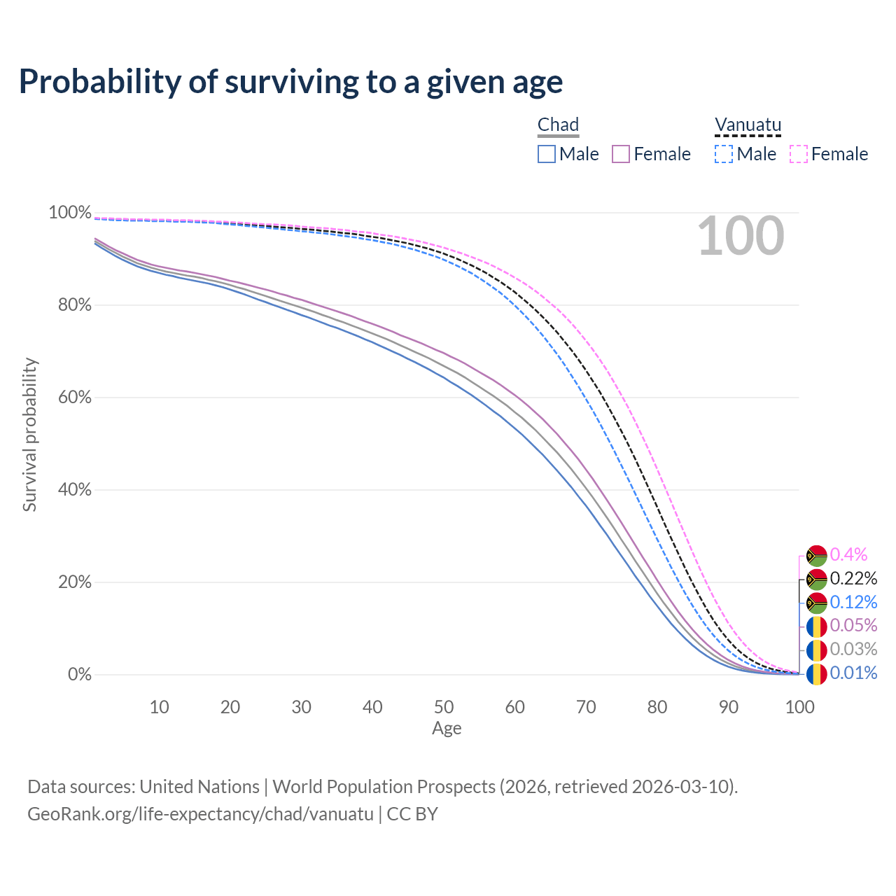 This life expectancy calculator shows the odds of living to 100, 95, 90, and below based on current age for both males and females in Chad and Vanuatu, along with mean and median age of death. The calculations are based on the 2026 life tables (actuarial tables) from the UN World Population Prospects.
