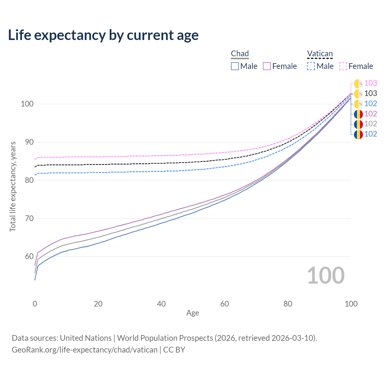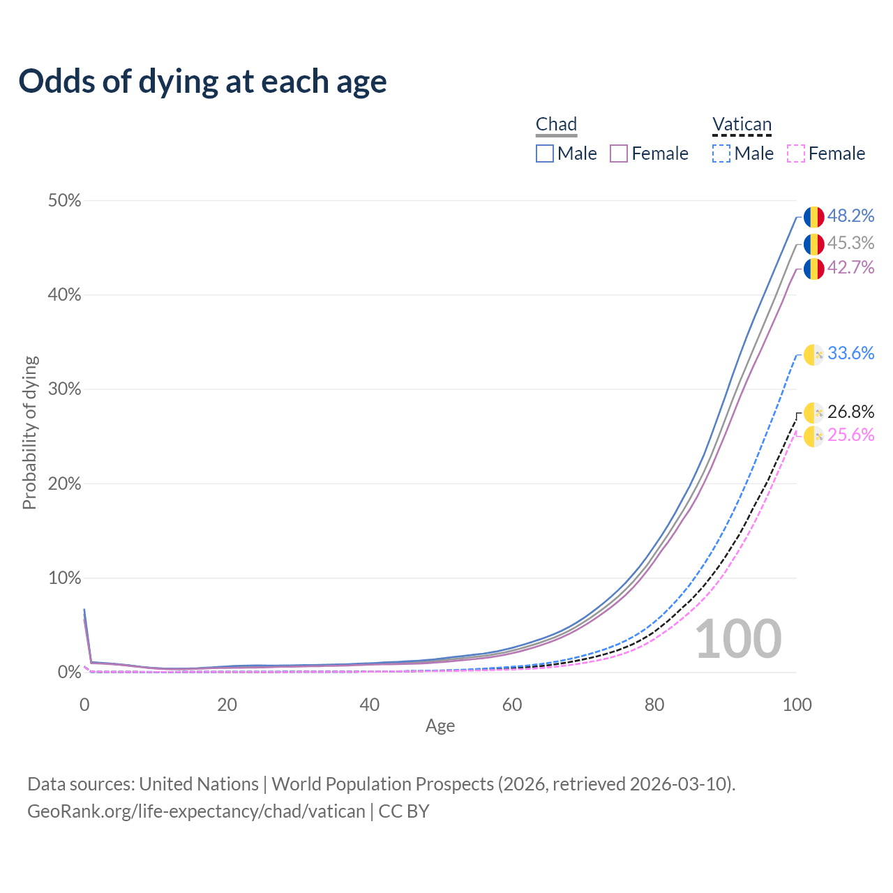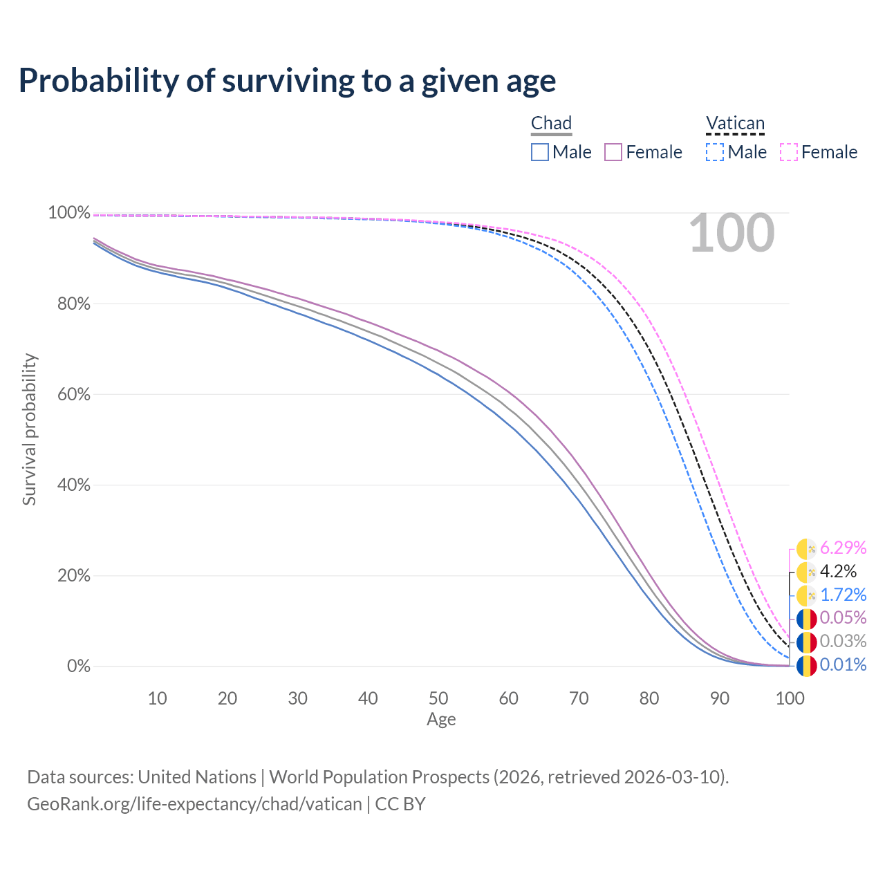 This life expectancy calculator shows the odds of living to 100, 95, 90, and below based on current age for both males and females in Chad and the Vatican, along with mean and median age of death. The calculations are based on the 2026 life tables (actuarial tables) from the UN World Population Prospects.
