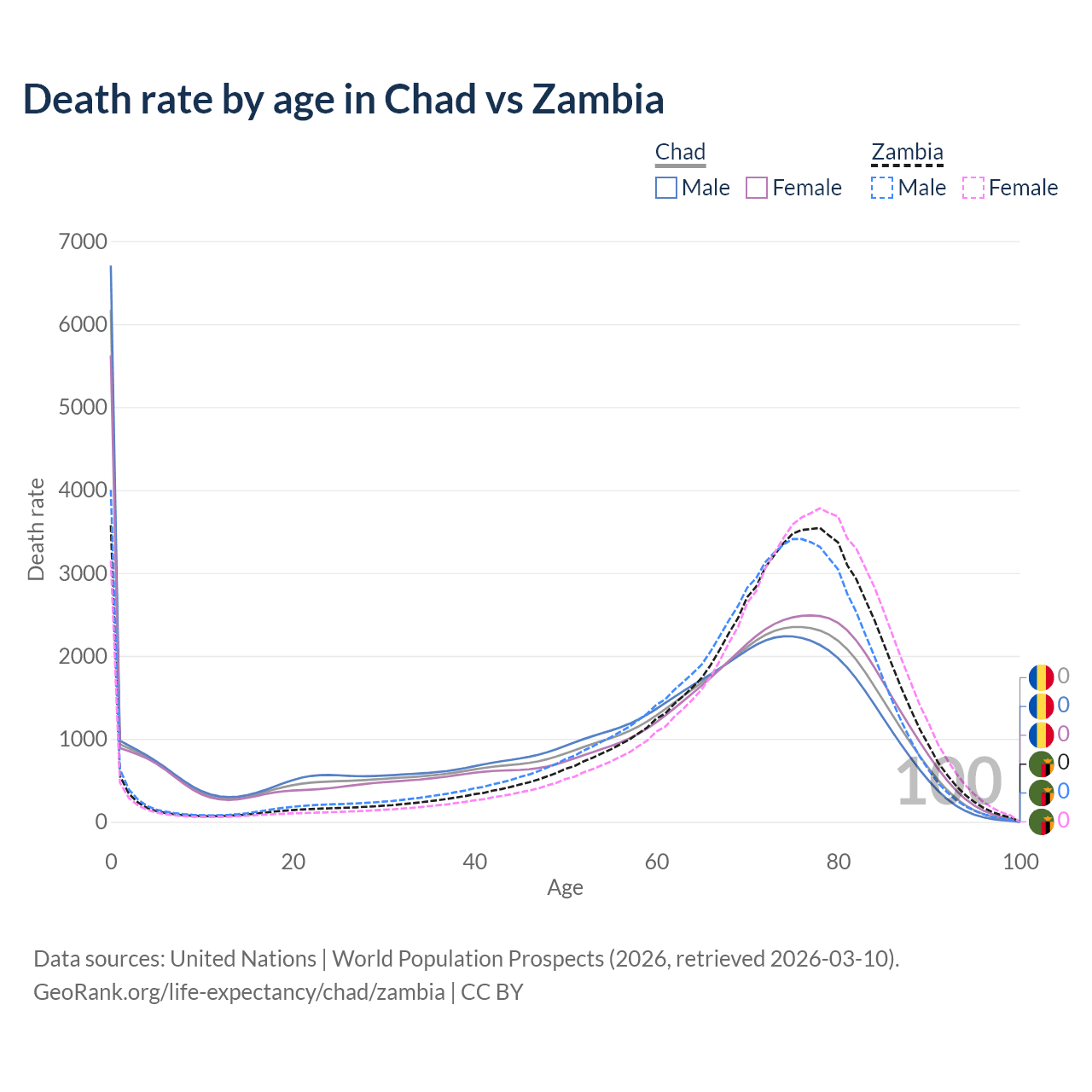 The average life expectancy at birth is 55.6 years in Chad vs 66.9 in Zambia. Chad is ranked 196/197 by life expectancy, and Zambia is 161/197. In Chad, the life expectancy is 53.7 years for males and 57.6 years for females. In Zambia, it's 64.4 years for males and 69.3 years for females.