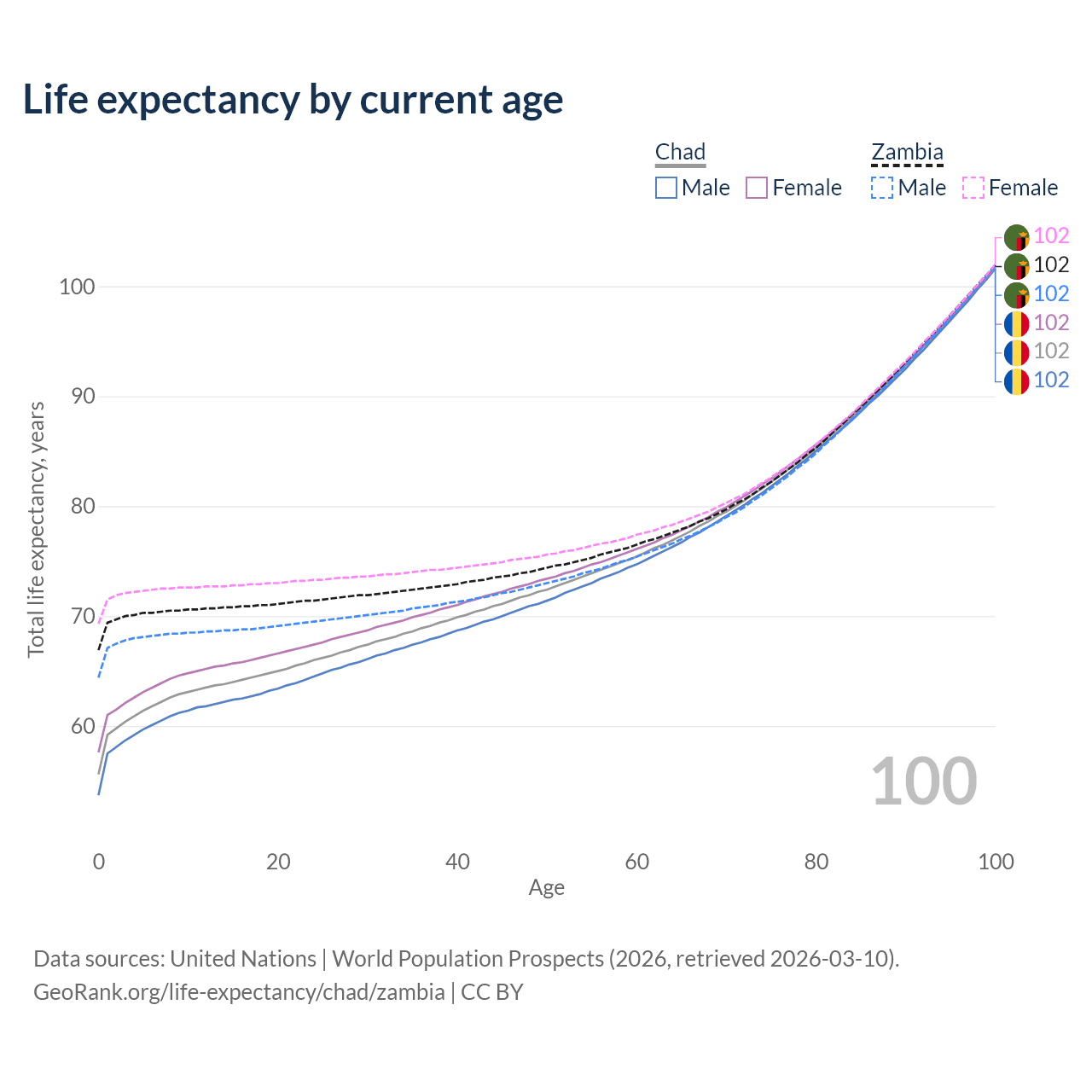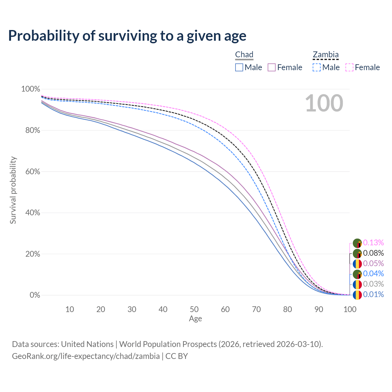 This life expectancy calculator shows the odds of living to 100, 95, 90, and below based on current age for both males and females in Chad and Zambia, along with mean and median age of death. The calculations are based on the 2026 life tables (actuarial tables) from the UN World Population Prospects.
