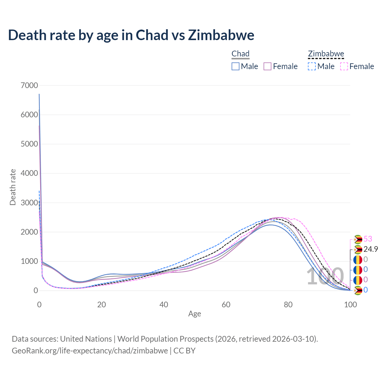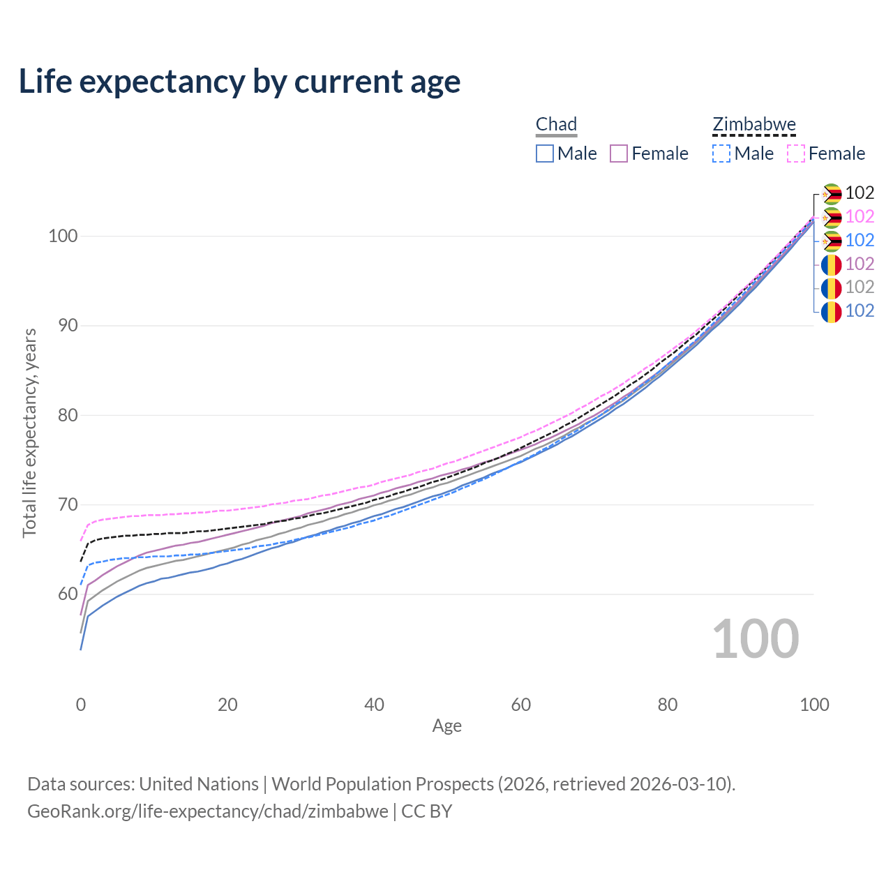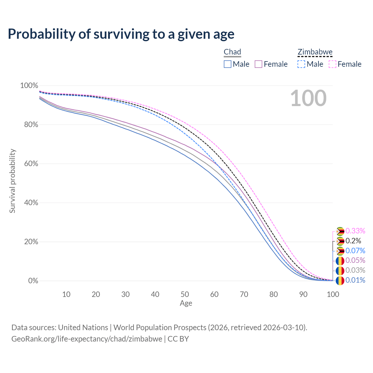 This life expectancy calculator shows the odds of living to 100, 95, 90, and below based on current age for both males and females in Chad and Zimbabwe, along with mean and median age of death. The calculations are based on the 2026 life tables (actuarial tables) from the UN World Population Prospects.