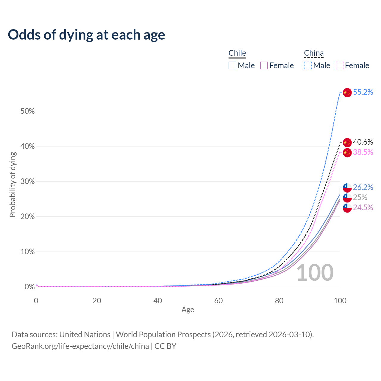 This life expectancy calculator shows the odds of living to 100, 95, 90, and below based on current age for both males and females in Chile and China, along with mean and median age of death. The calculations are based on the 2026 life tables (actuarial tables) from the UN World Population Prospects.