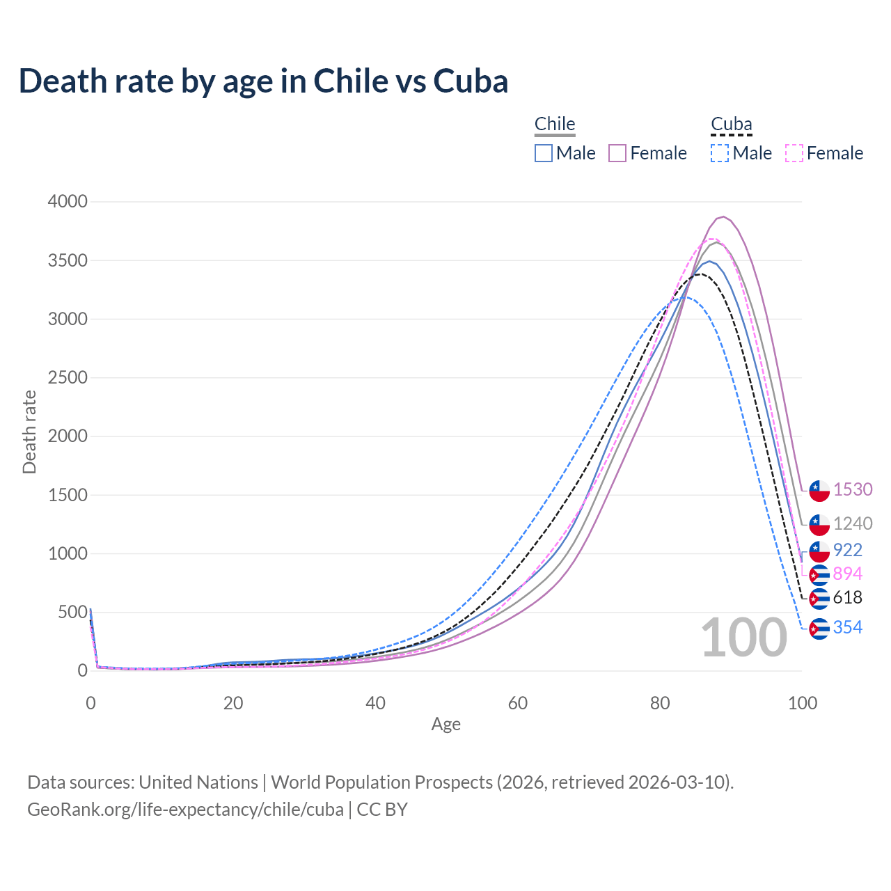 This life expectancy calculator shows the odds of living to 100, 95, 90, and below based on current age for both males and females in Chile and Cuba, along with mean and median age of death. The calculations are based on the 2026 life tables (actuarial tables) from the UN World Population Prospects.