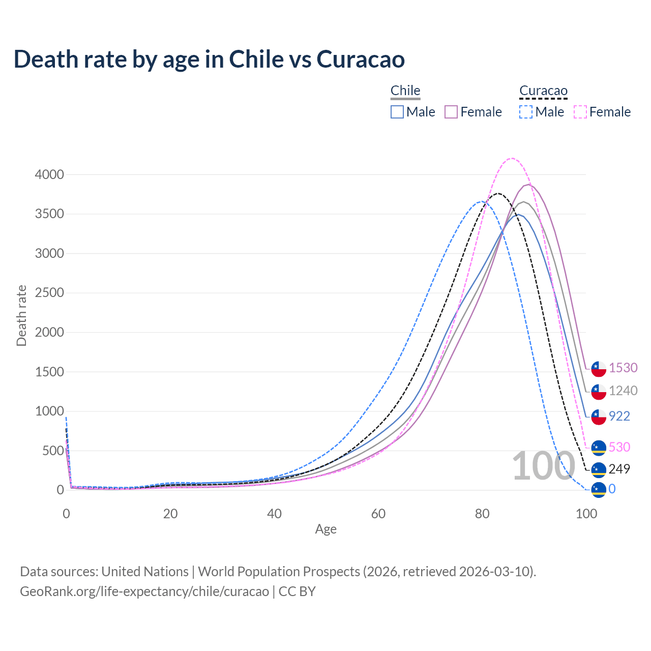 In Chile, the most common age of death is 88, compared to 83 in Curacao. The median age of death is 84.8 in Chile and 80.4 in Curacao, meaning only half of each cohort is expected to live past that age.