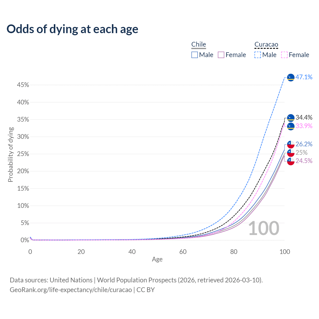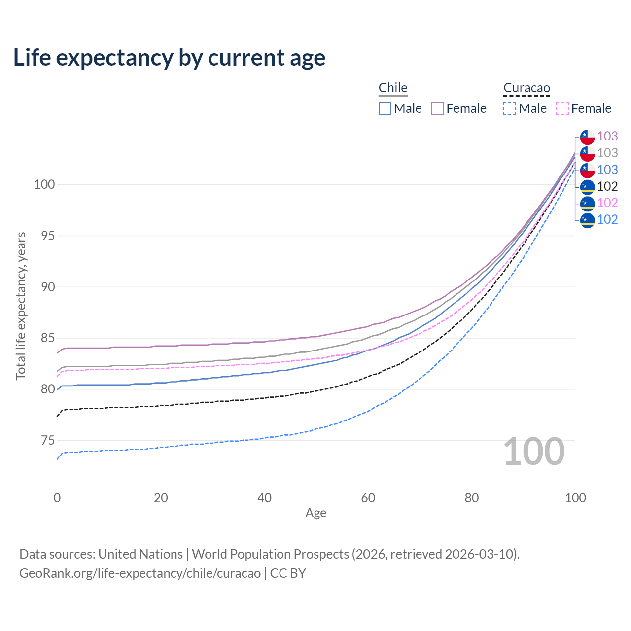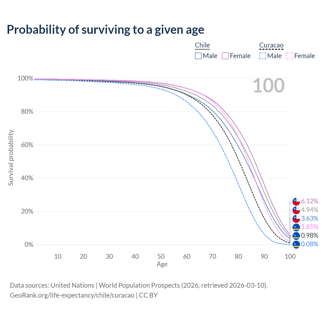 This life expectancy calculator shows the odds of living to 100, 95, 90, and below based on current age for both males and females in Chile and Curacao, along with mean and median age of death. The calculations are based on the 2026 life tables (actuarial tables) from the UN World Population Prospects.