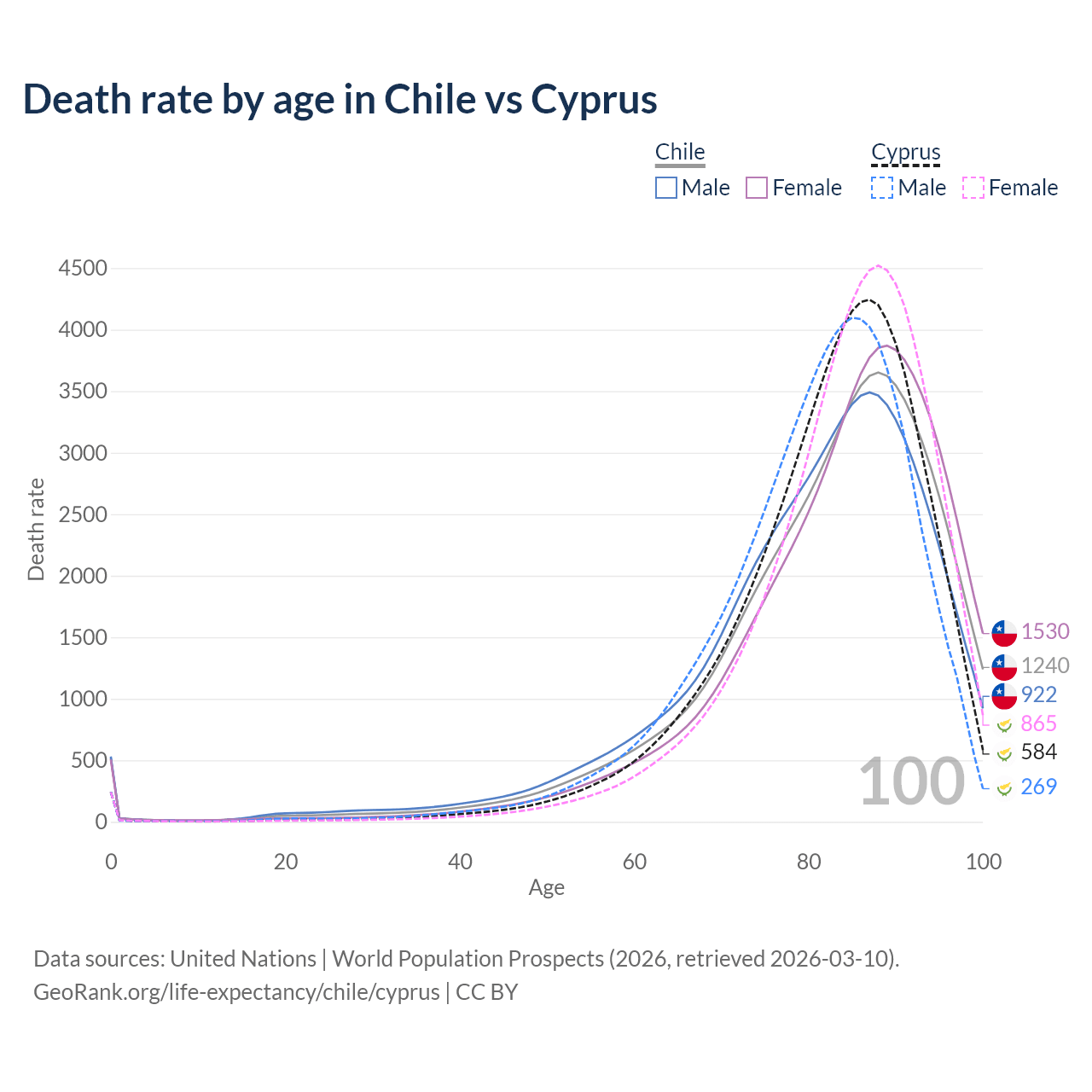 In Chile, the most common age of death is 88, compared to 87 in Cyprus. The median age of death is 84.8 in Chile and 84.3 in Cyprus, meaning only half of each cohort is expected to live past that age.
