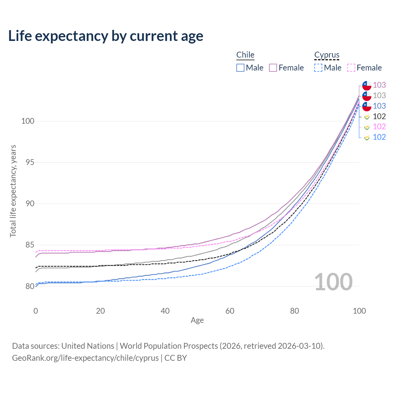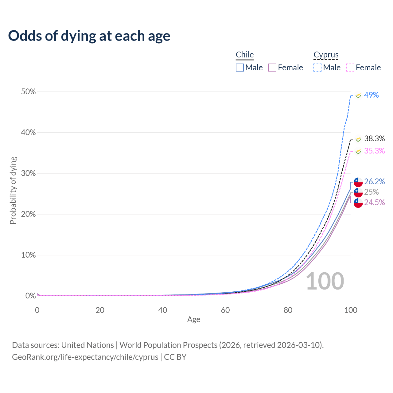 This life expectancy calculator shows the odds of living to 100, 95, 90, and below based on current age for both males and females in Chile and Cyprus, along with mean and median age of death. The calculations are based on the 2026 life tables (actuarial tables) from the UN World Population Prospects.