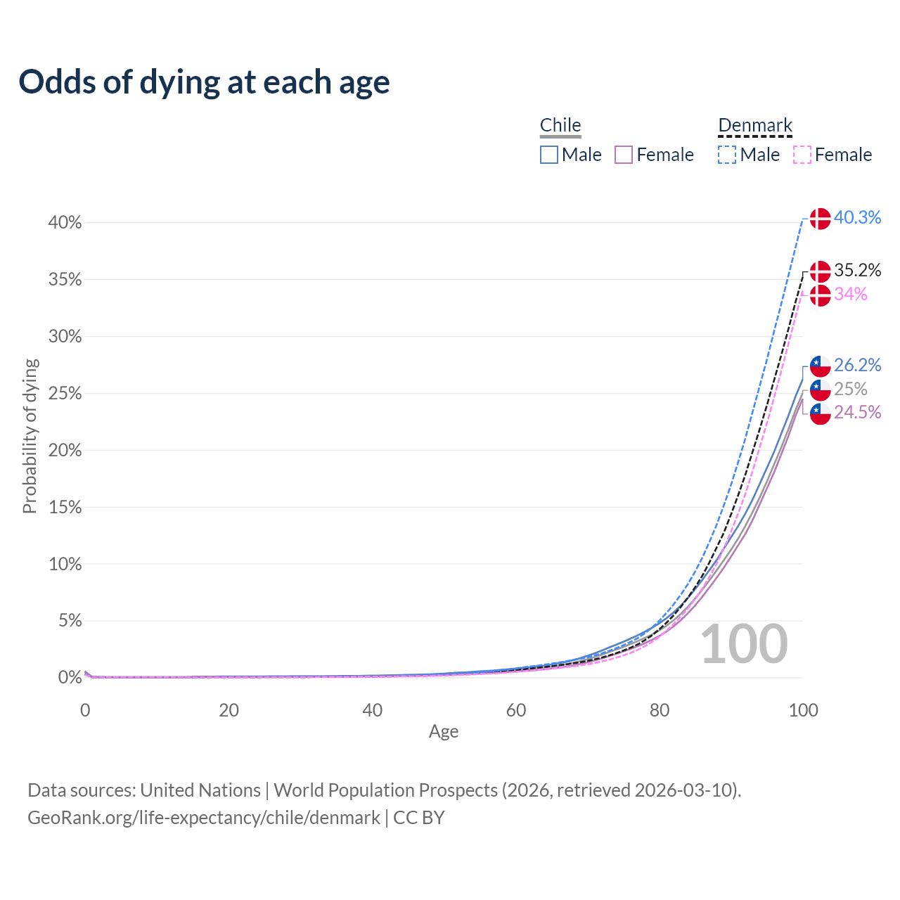 This life expectancy calculator shows the odds of living to 100, 95, 90, and below based on current age for both males and females in Chile and Denmark, along with mean and median age of death. The calculations are based on the 2026 life tables (actuarial tables) from the UN World Population Prospects.