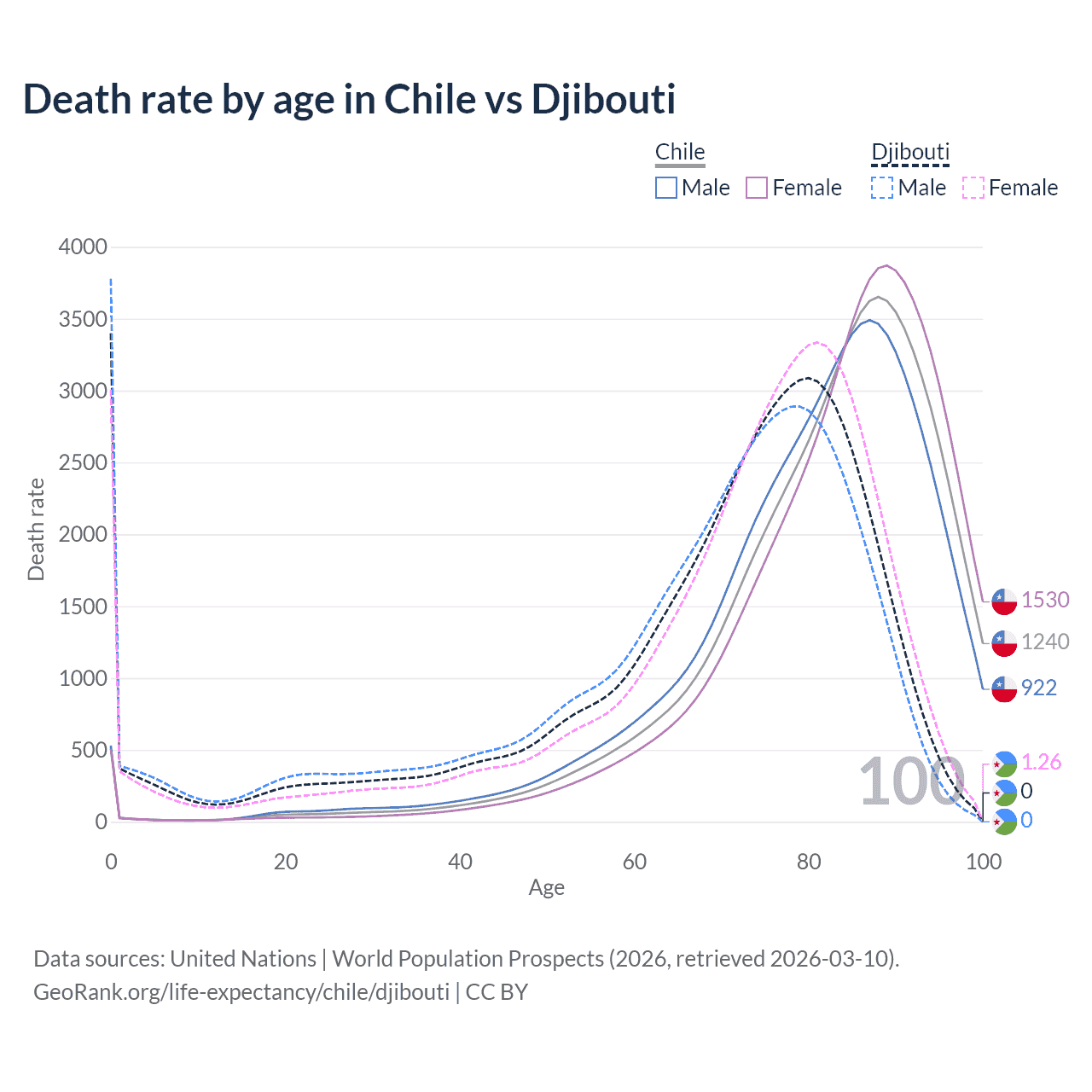 In Chile, the most common age of death is 88, compared to 0 in Djibouti. The median age of death is 84.8 in Chile and 73.7 in Djibouti, meaning only half of each cohort is expected to live past that age.