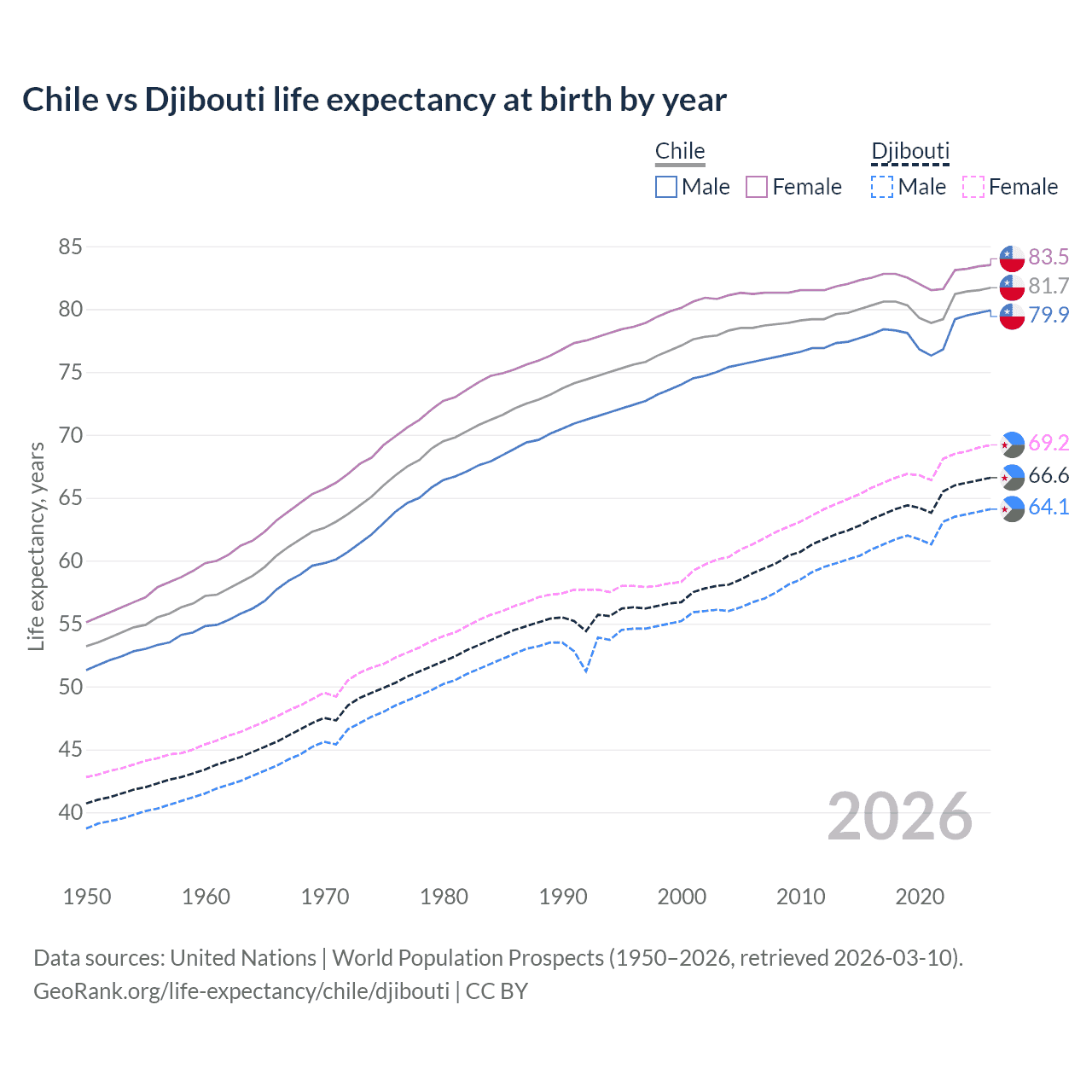 The average life expectancy at birth is 81.7 years in Chile vs 66.6 in Djibouti. Chile is ranked 38/197 by life expectancy, and Djibouti is 165/197. In Chile, the life expectancy is 79.9 years for males and 83.5 years for females. In Djibouti, it's 64.1 years for males and 69.2 years for females.