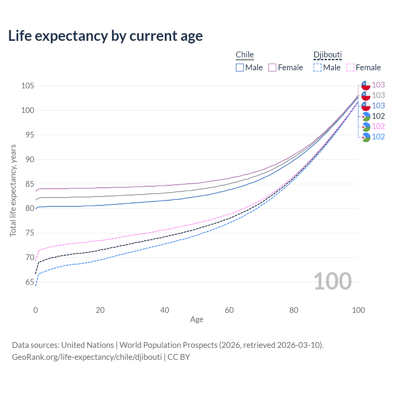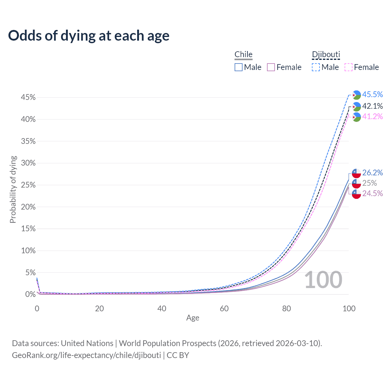 This life expectancy calculator shows the odds of living to 100, 95, 90, and below based on current age for both males and females in Chile and Djibouti, along with mean and median age of death. The calculations are based on the 2026 life tables (actuarial tables) from the UN World Population Prospects.