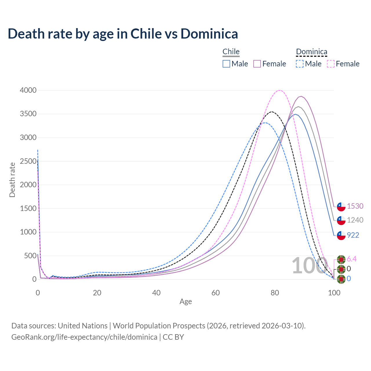 This life expectancy calculator shows the odds of living to 100, 95, 90, and below based on current age for both males and females in Chile and Dominica, along with mean and median age of death. The calculations are based on the 2026 life tables (actuarial tables) from the UN World Population Prospects.